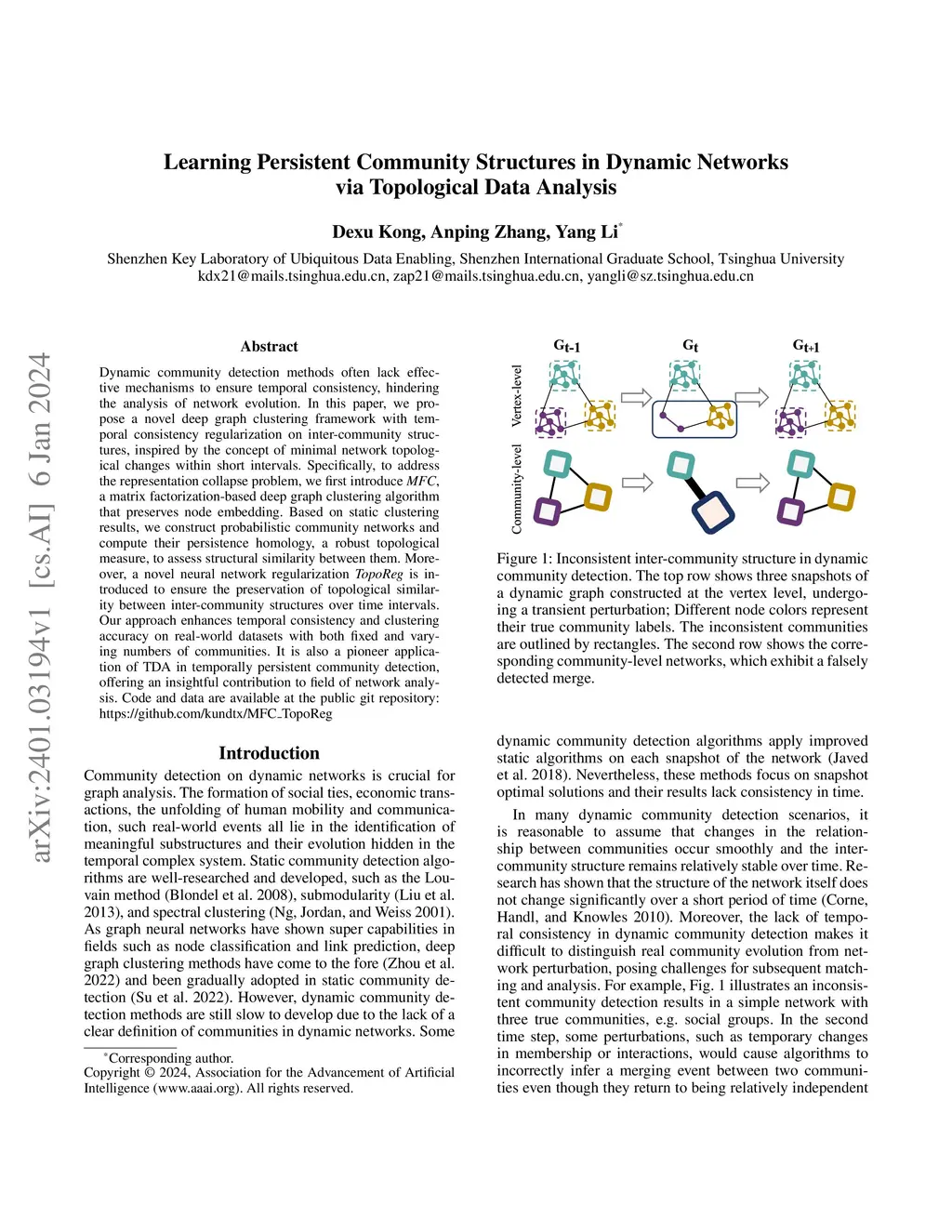 Dynamic community detection methods often lack effective mechanisms to ensure temporal consistency, hindering the analysis of network evolution. In this paper, we propose a novel deep graph clustering framework with temporal consistency regularization on inter-community structures, inspired by the concept of minimal network topological changes within short intervals. Specifically, to address the representation collapse problem, we first introduce MFC, a matrix factorization-based deep graph clustering algorithm that preserves node embedding. Based on static clustering results, we construct probabilistic community networks and compute their persistence homology, a robust topological measure, to assess structural similarity between them. Moreover, a novel neural network regularization TopoReg is introduced to ensure the preservation of topological similarity between inter-community structures over time intervals. Our approach enhances temporal consistency and clustering accuracy on real-world datasets with both fixed and varying numbers of communities. It is also a pioneer application of TDA in temporally persistent community detection, offering an insightful contribution to field of network analysis. Code and data are available at the public git repository: https://github.com/kundtx/MFC_TopoReg