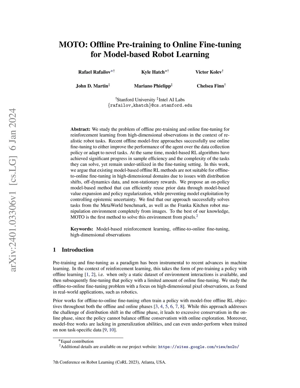 We study the problem of offline pre-training and online fine-tuning for reinforcement learning from high-dimensional observations in the context of realistic robot tasks. Recent offline model-free approaches successfully use online fine-tuning to either improve the performance of the agent over the data collection policy or adapt to novel tasks. At the same time, model-based RL algorithms have achieved significant progress in sample efficiency and the complexity of the tasks they can solve, yet remain under-utilized in the fine-tuning setting. In this work, we argue that existing model-based offline RL methods are not suitable for offline-to-online fine-tuning in high-dimensional domains due to issues with distribution shifts, off-dynamics data, and non-stationary rewards. We propose an on-policy model-based method that can efficiently reuse prior data through model-based value expansion and policy regularization, while preventing model exploitation by controlling epistemic uncertainty. We find that our approach successfully solves tasks from the MetaWorld benchmark, as well as the Franka Kitchen robot manipulation environment completely from images. To the best of our knowledge, MOTO is the first method to solve this environment from pixels.