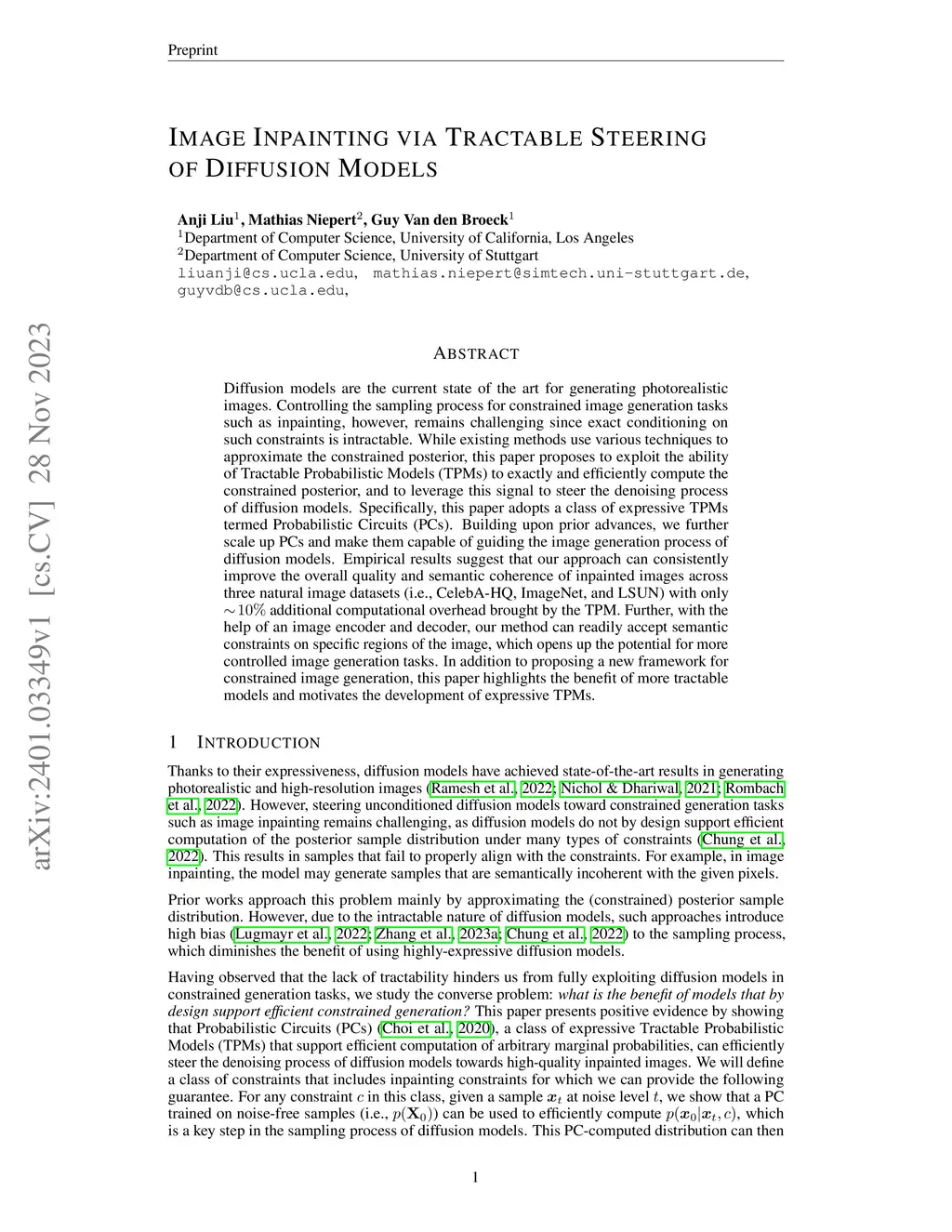 Diffusion models are the current state of the art for generating photorealistic images. Controlling the sampling process for constrained image generation tasks such as inpainting, however, remains challenging since exact conditioning on such constraints is intractable. While existing methods use various techniques to approximate the constrained posterior, this paper proposes to exploit the ability of Tractable Probabilistic Models (TPMs) to exactly and efficiently compute the constrained posterior, and to leverage this signal to steer the denoising process of diffusion models. Specifically, this paper adopts a class of expressive TPMs termed Probabilistic Circuits (PCs). Building upon prior advances, we further scale up PCs and make them capable of guiding the image generation process of diffusion models. Empirical results suggest that our approach can consistently improve the overall quality and semantic coherence of inpainted images across three natural image datasets (i.e., CelebA-HQ, ImageNet, and LSUN) with only ~10% additional computational overhead brought by the TPM. Further, with the help of an image encoder and decoder, our method can readily accept semantic constraints on specific regions of the image, which opens up the potential for more controlled image generation tasks. In addition to proposing a new framework for constrained image generation, this paper highlights the benefit of more tractable models and motivates the development of expressive TPMs.