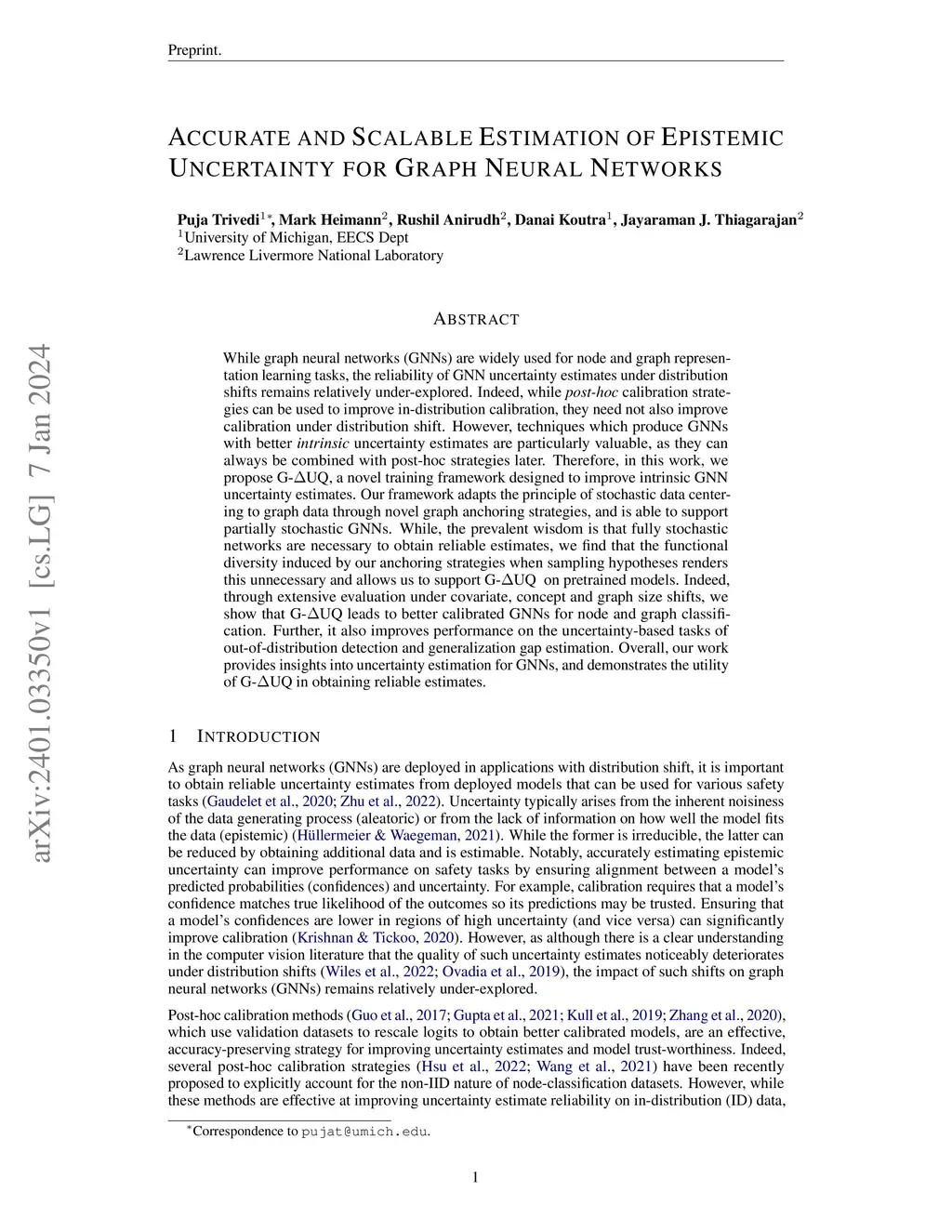 While graph neural networks (GNNs) are widely used for node and graph representation learning tasks, the reliability of GNN uncertainty estimates under distribution shifts remains relatively under-explored. Indeed, while post-hoc calibration strategies can be used to improve in-distribution calibration, they need not also improve calibration under distribution shift. However, techniques which produce GNNs with better intrinsic uncertainty estimates are particularly valuable, as they can always be combined with post-hoc strategies later. Therefore, in this work, we propose G-UQ, a novel training framework designed to improve intrinsic GNN uncertainty estimates. Our framework adapts the principle of stochastic data centering to graph data through novel graph anchoring strategies, and is able to support partially stochastic GNNs. While, the prevalent wisdom is that fully stochastic networks are necessary to obtain reliable estimates, we find that the functional diversity induced by our anchoring strategies when sampling hypotheses renders this unnecessary and allows us to support G-UQ on pretrained models. Indeed, through extensive evaluation under covariate, concept and graph size shifts, we show that G-UQ leads to better calibrated GNNs for node and graph classification. Further, it also improves performance on the uncertainty-based tasks of out-of-distribution detection and generalization gap estimation. Overall, our work provides insights into uncertainty estimation for GNNs, and demonstrates the utility of G-UQ in obtaining reliable estimates.