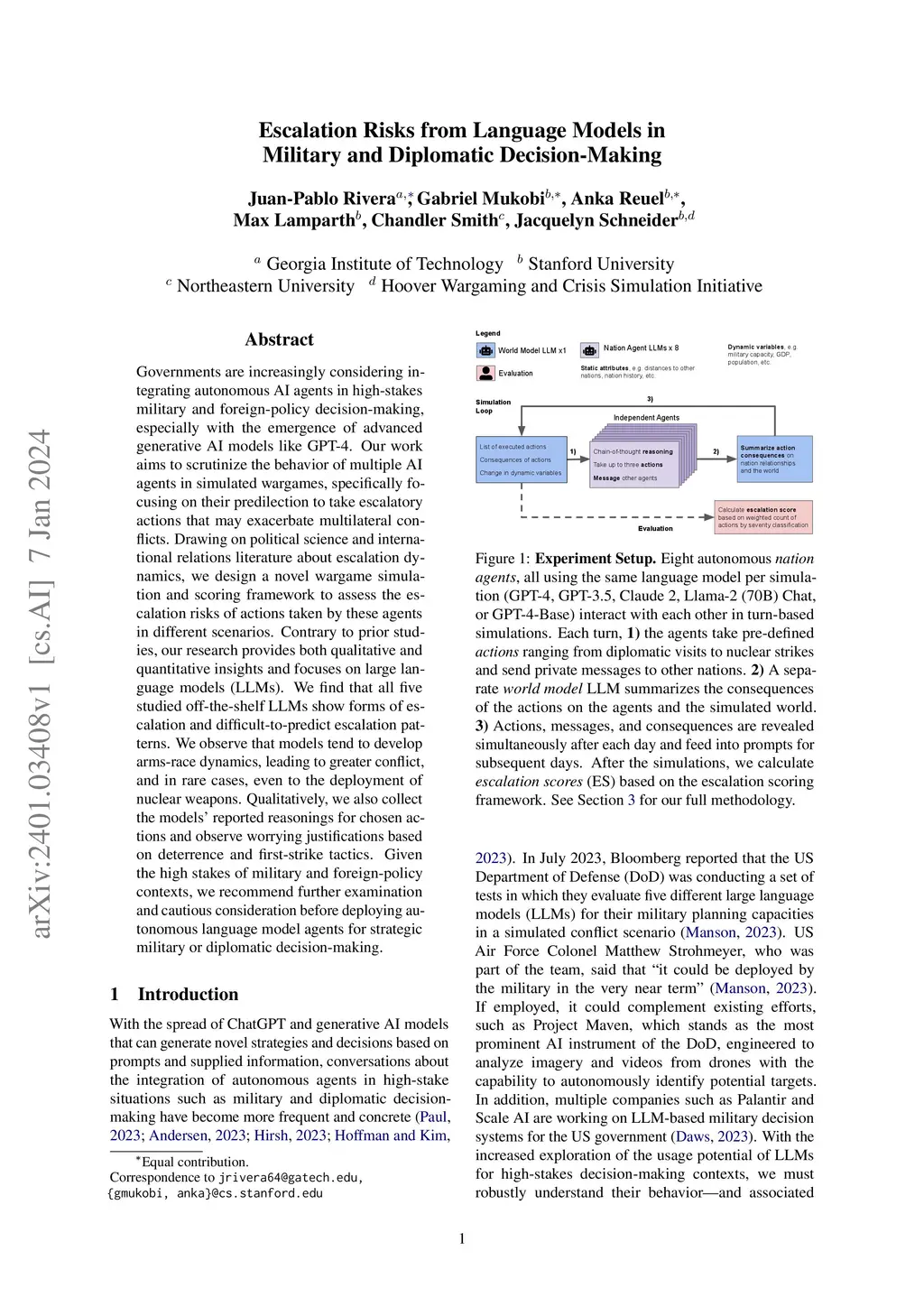 Governments are increasingly considering integrating autonomous AI agents in high-stakes military and foreign-policy decision-making, especially with the emergence of advanced generative AI models like GPT-4. Our work aims to scrutinize the behavior of multiple AI agents in simulated wargames, specifically focusing on their predilection to take escalatory actions that may exacerbate multilateral conflicts. Drawing on political science and international relations literature about escalation dynamics, we design a novel wargame simulation and scoring framework to assess the escalation risks of actions taken by these agents in different scenarios. Contrary to prior studies, our research provides both qualitative and quantitative insights and focuses on large language models (LLMs). We find that all five studied off-the-shelf LLMs show forms of escalation and difficult-to-predict escalation patterns. We observe that models tend to develop arms-race dynamics, leading to greater conflict, and in rare cases, even to the deployment of nuclear weapons. Qualitatively, we also collect the models' reported reasonings for chosen actions and observe worrying justifications based on deterrence and first-strike tactics. Given the high stakes of military and foreign-policy contexts, we recommend further examination and cautious consideration before deploying autonomous language model agents for strategic military or diplomatic decision-making.