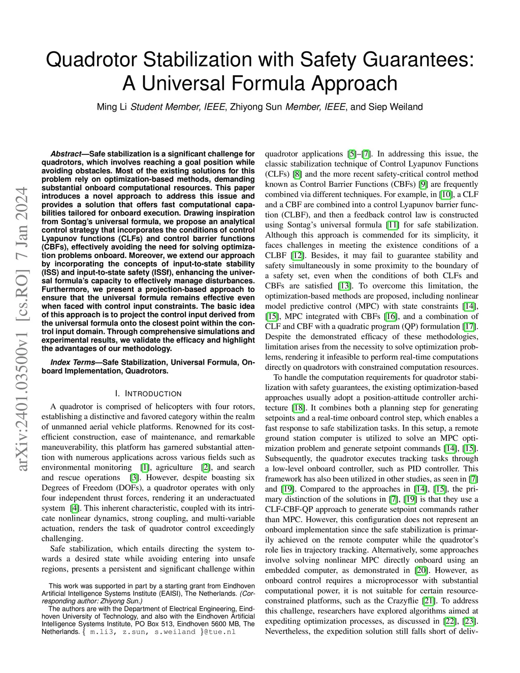 Safe stabilization is a significant challenge for quadrotors, which involves reaching a goal position while avoiding obstacles. Most of the existing solutions for this problem rely on optimization-based methods, demanding substantial onboard computational resources. This paper introduces a novel approach to address this issue and provides a solution that offers fast computational capabilities tailored for onboard execution. Drawing inspiration from Sontag's universal formula, we propose an analytical control strategy that incorporates the conditions of control Lyapunov functions (CLFs) and control barrier functions (CBFs), effectively avoiding the need for solving optimization problems onboard. Moreover, we extend our approach by incorporating the concepts of input-to-state stability (ISS) and input-to-state safety (ISSf), enhancing the universal formula's capacity to effectively manage disturbances. Furthermore, we present a projection-based approach to ensure that the universal formula remains effective even when faced with control input constraints. The basic idea of this approach is to project the control input derived from the universal formula onto the closest point within the control input domain. Through comprehensive simulations and experimental results, we validate the efficacy and highlight the advantages of our methodology.