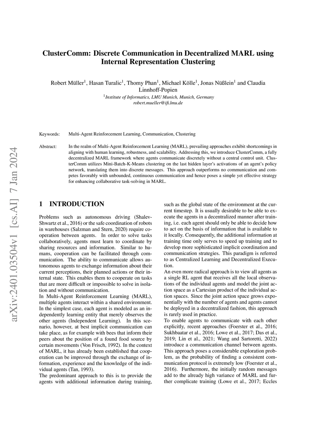 ClusterComm: Discrete Communication in Decentralized MARL using Internal