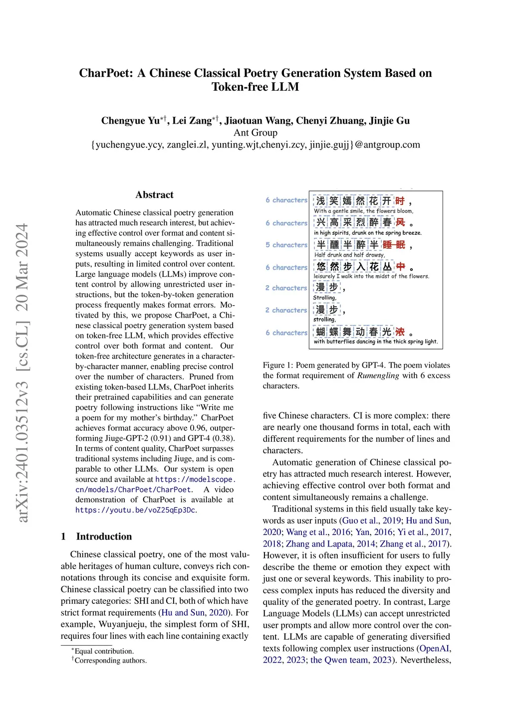 Automatic Chinese classical poetry generation has attracted much research interest, but achieving effective control over format and content simultaneously remains challenging. Traditional systems usually accept keywords as user inputs, resulting in limited control over content. Large language models (LLMs) improve content control by allowing unrestricted user instructions, but the token-by-token generation process frequently makes format errors. Motivated by this, we propose CharPoet, a Chinese classical poetry generation system based on token-free LLM, which provides effective control over both format and content. Our token-free architecture generates in a character-by-character manner, enabling precise control over the number of characters. Pruned from existing token-based LLMs, CharPoet inherits their pretrained capabilities and can generate poetry following instructions like "Write me a poem for my mother's birthday." CharPoet achieves format accuracy above 0.96, outperforming Jiuge-GPT-2 (0.91) and GPT-4 (0.38). In terms of content quality, CharPoet surpasses traditional systems including Jiuge, and is comparable to other LLMs. Our system is open source and available at https://modelscope.cn/models/CharPoet/CharPoet. A video demonstration of CharPoet is available at https://youtu.be/voZ25qEp3Dc.