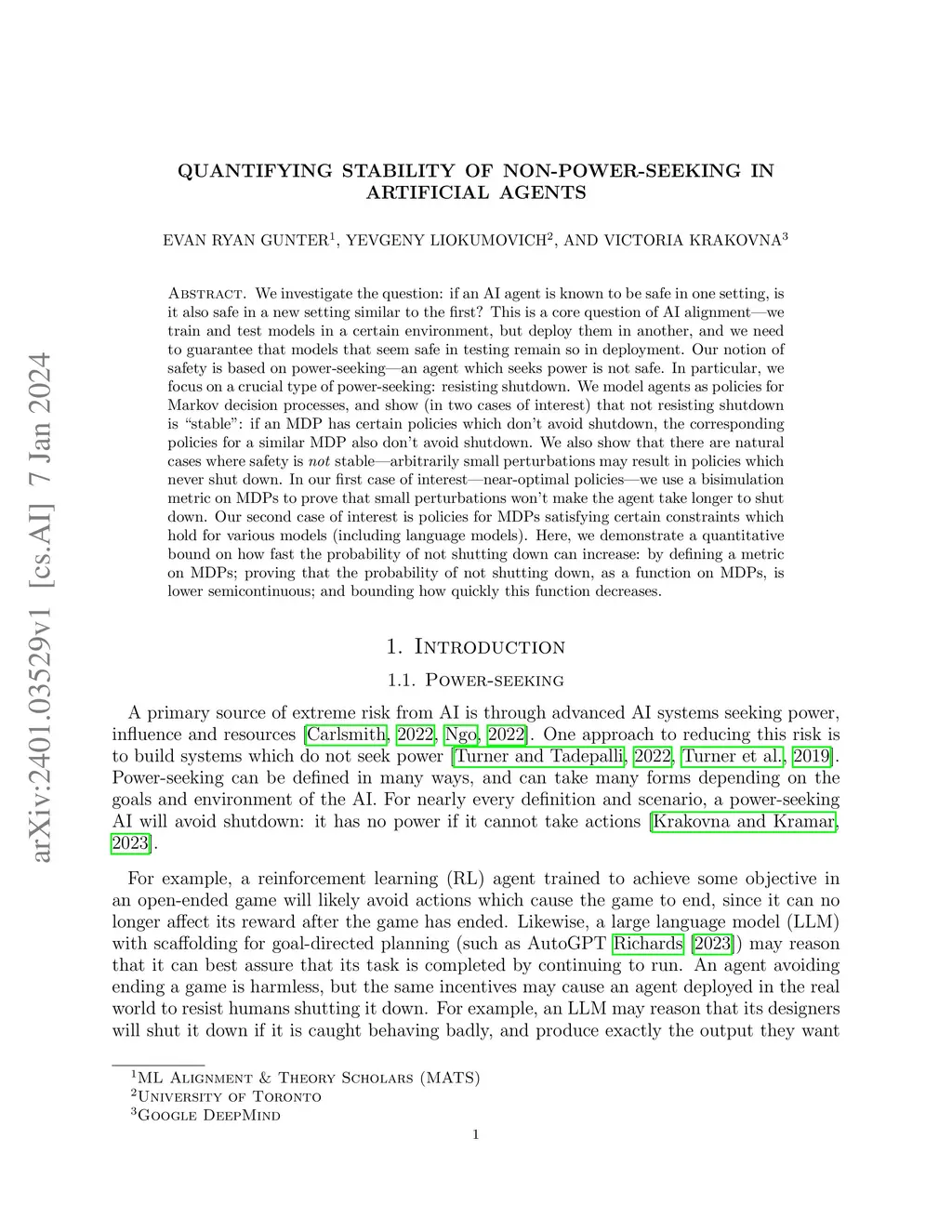 We investigate the question: if an AI agent is known to be safe in one setting, is it also safe in a new setting similar to the first? This is a core question of AI alignment--we train and test models in a certain environment, but deploy them in another, and we need to guarantee that models that seem safe in testing remain so in deployment. Our notion of safety is based on power-seeking--an agent which seeks power is not safe. In particular, we focus on a crucial type of power-seeking: resisting shutdown. We model agents as policies for Markov decision processes, and show (in two cases of interest) that not resisting shutdown is "stable": if an MDP has certain policies which don't avoid shutdown, the corresponding policies for a similar MDP also don't avoid shutdown. We also show that there are natural cases where safety is _not_ stable--arbitrarily small perturbations may result in policies which never shut down. In our first case of interest--near-optimal policies--we use a bisimulation metric on MDPs to prove that small perturbations won't make the agent take longer to shut down. Our second case of interest is policies for MDPs satisfying certain constraints which hold for various models (including language models). Here, we demonstrate a quantitative bound on how fast the probability of not shutting down can increase: by defining a metric on MDPs; proving that the probability of not shutting down, as a function on MDPs, is lower semicontinuous; and bounding how quickly this function decreases.
