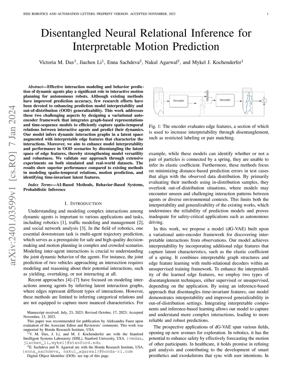 Effective interaction modeling and behavior prediction of dynamic agents play a significant role in interactive motion planning for autonomous robots. Although existing methods have improved prediction accuracy, few research efforts have been devoted to enhancing prediction model interpretability and out-of-distribution (OOD) generalizability. This work addresses these two challenging aspects by designing a variational auto-encoder framework that integrates graph-based representations and time-sequence models to efficiently capture spatio-temporal relations between interactive agents and predict their dynamics. Our model infers dynamic interaction graphs in a latent space augmented with interpretable edge features that characterize the interactions. Moreover, we aim to enhance model interpretability and performance in OOD scenarios by disentangling the latent space of edge features, thereby strengthening model versatility and robustness. We validate our approach through extensive experiments on both simulated and real-world datasets. The results show superior performance compared to existing methods in modeling spatio-temporal relations, motion prediction, and identifying time-invariant latent features.