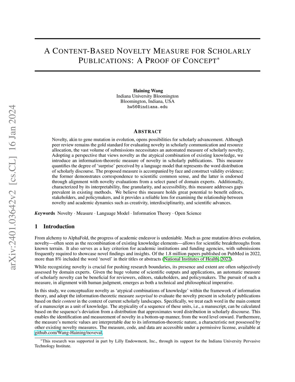 A Content-Based Novelty Measure for Scholarly Publications: A Proof of