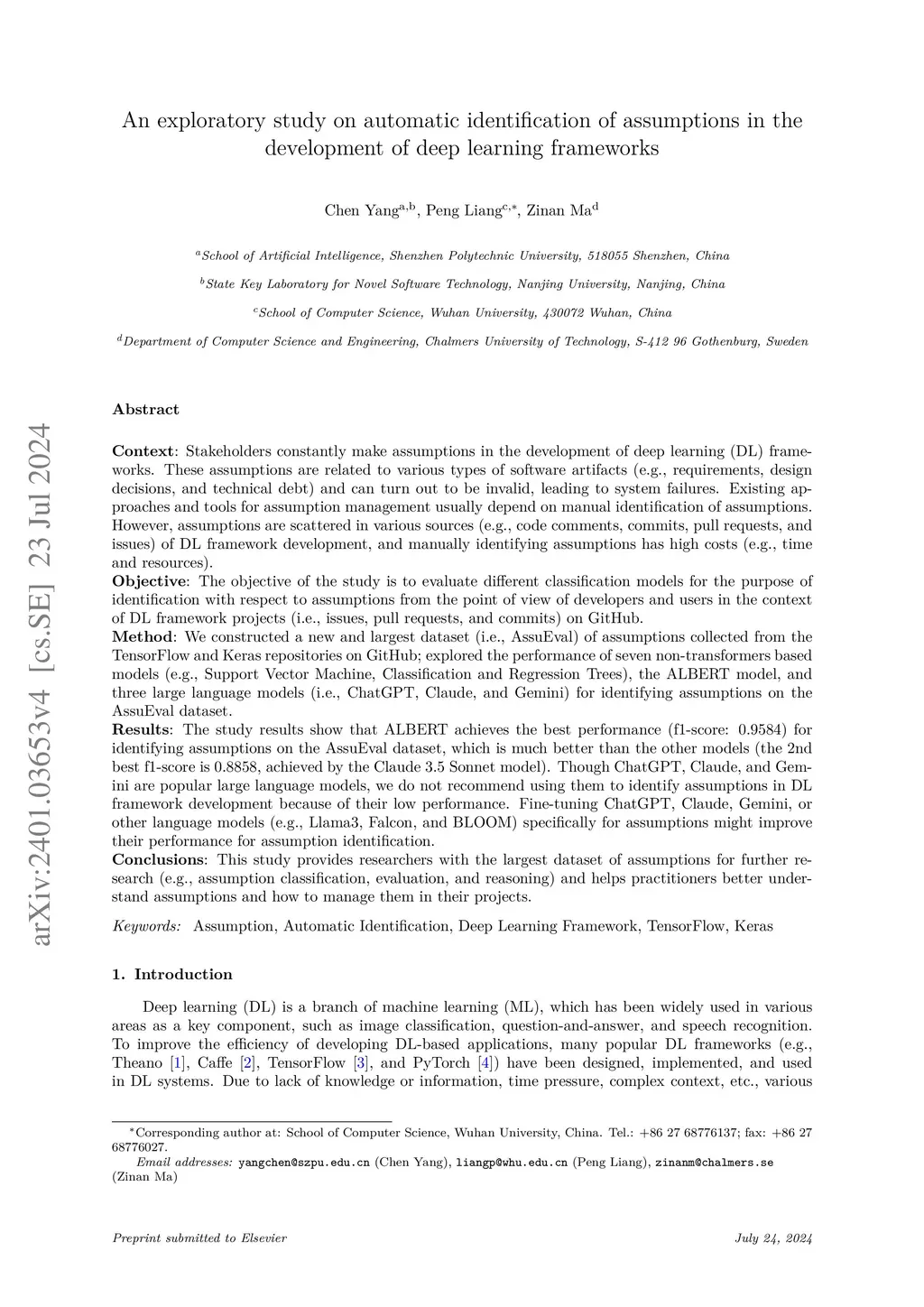 Stakeholders constantly make assumptions in the development of deep learning (DL) frameworks. These assumptions are related to various types of software artifacts (e.g., requirements, design decisions, and technical debt) and can turn out to be invalid, leading to system failures. Existing approaches and tools for assumption management usually depend on manual identification of assumptions. However, assumptions are scattered in various sources (e.g., code comments, commits, pull requests, and issues) of DL framework development, and manually identifying assumptions has high costs (e.g., time and resources). To overcome the issues of manually identifying assumptions in DL framework development, we constructed a new and largest dataset (i.e., AssuEval) of assumptions collected from the TensorFlow and Keras repositories on GitHub; explored the performance of seven traditional machine learning models (e.g., Support Vector Machine, Classification and Regression Trees), a popular DL model (i.e., ALBERT), and a large language model (i.e., ChatGPT) of identifying assumptions on the AssuEval dataset. The experiment results show that: ALBERT achieves the best performance (f1-score: 0.9584) of identifying assumptions on the AssuEval dataset, which is much better than the other models (the 2nd best f1-score is 0.6211, achieved by ChatGPT). Though ChatGPT is the most popular large language model, we do not recommend using it to identify assumptions in DL framework development because of its low performance on the task. Fine-tuning ChatGPT specifically for assumption identification could improve the performance. This study provides researchers with the largest dataset of assumptions for further research (e.g., assumption classification, evaluation, and reasoning) and helps practitioners better understand assumptions and how to manage them in their projects.