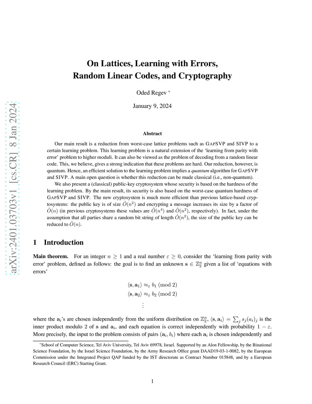 On Lattices, Learning with Errors, Random Linear Codes, and Cryptography