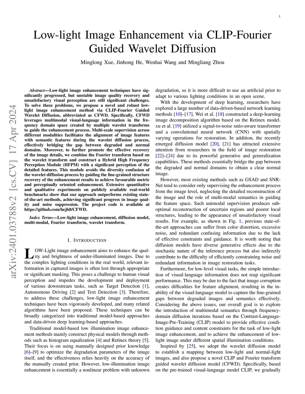 Low-light image enhancement techniques have significantly progressed, but unstable image quality recovery and unsatisfactory visual perception are still significant challenges. To solve these problems, we propose a novel and robust low-light image enhancement method via CLIP-Fourier Guided Wavelet Diffusion, abbreviated as CFWD. Specifically, CFWD leverages multimodal visual-language information in the frequency domain space created by multiple wavelet transforms to guide the enhancement process. Multi-scale supervision across different modalities facilitates the alignment of image features with semantic features during the wavelet diffusion process, effectively bridging the gap between degraded and normal domains. Moreover, to further promote the effective recovery of the image details, we combine the Fourier transform based on the wavelet transform and construct a Hybrid High Frequency Perception Module (HFPM) with a significant perception of the detailed features. This module avoids the diversity confusion of the wavelet diffusion process by guiding the fine-grained structure recovery of the enhancement results to achieve favourable metric and perceptually oriented enhancement. Extensive quantitative and qualitative experiments on publicly available real-world benchmarks show that our approach outperforms existing state-of-the-art methods, achieving significant progress in image quality and noise suppression. The project code is available at https://github.com/hejh8/CFWD.