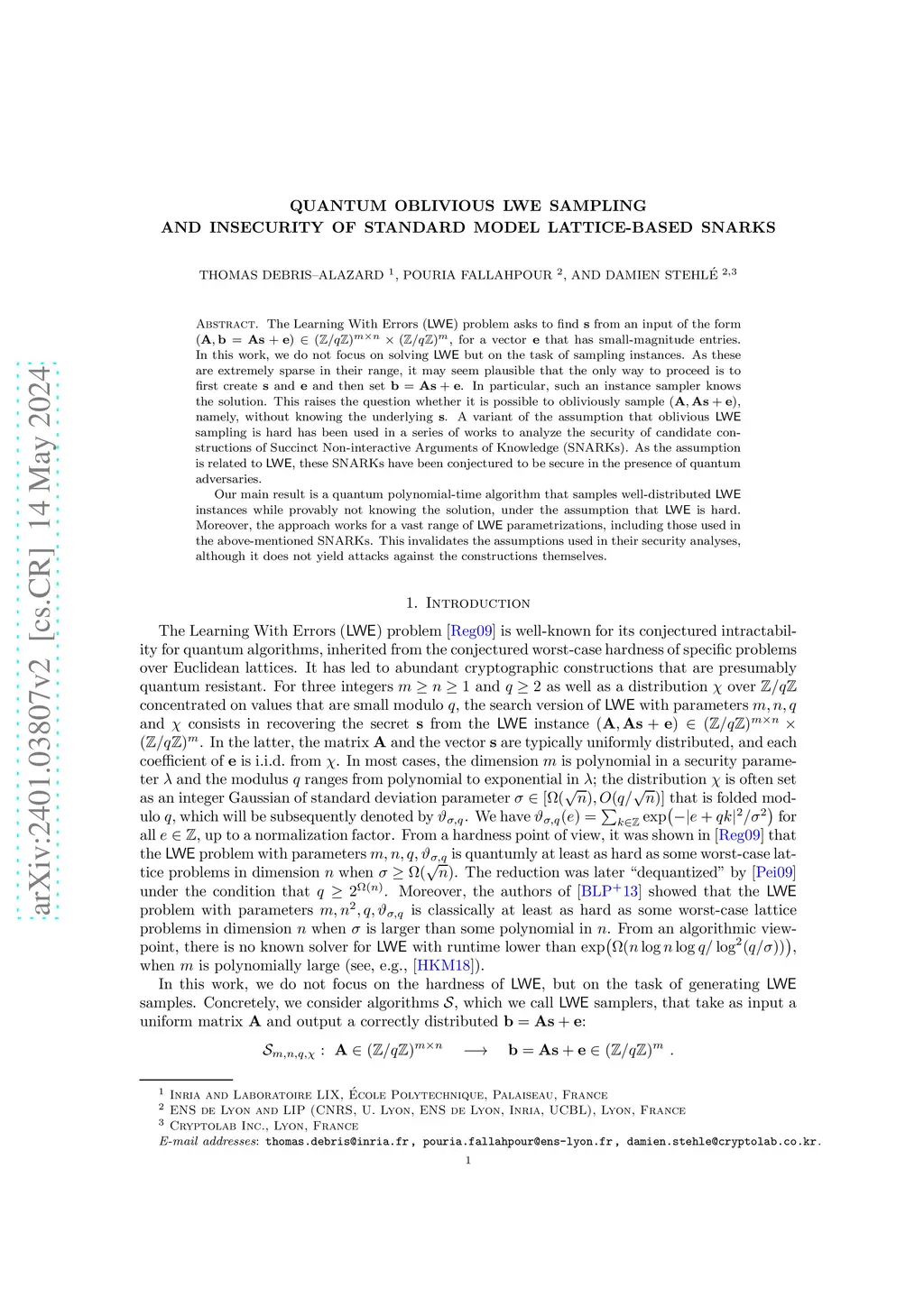 The Learning With Errors () problem asks to find from an input of the form , for a vector that has small-magnitude entries. In this work, we do not focus on solving but on the task of sampling instances. As these are extremely sparse in their range, it may seem plausible that the only way to proceed is to first create and and then set . In particular, such an instance sampler knows the solution. This raises the question whether it is possible to obliviously sample , namely, without knowing the underlying . A variant of the assumption that oblivious sampling is hard has been used in a series of works to analyze the security of candidate constructions of Succinct Non interactive Arguments of Knowledge (SNARKs). As the assumption is related to , these SNARKs have been conjectured to be secure in the presence of quantum adversaries. Our main result is a quantum polynomial-time algorithm that samples well-distributed instances while provably not knowing the solution, under the assumption that is hard. Moreover, the approach works for a vast range of parametrizations, including those used in the above-mentioned SNARKs. This invalidates the assumptions used in their security analyses, although it does not yield attacks against the constructions themselves.