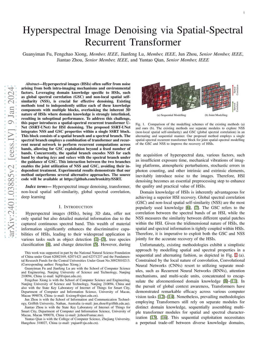 Hyperspectral images (HSIs) often suffer from noise arising from both intra-imaging mechanisms and environmental factors. Leveraging domain knowledge specific to HSIs, such as global spectral correlation (GSC) and non-local spatial self-similarity (NSS), is crucial for effective denoising. Existing methods tend to independently utilize each of these knowledge components with multiple blocks, overlooking the inherent 3D nature of HSIs where domain knowledge is strongly interlinked, resulting in suboptimal performance. To address this challenge, this paper introduces a spatial-spectral recurrent transformer U-Net (SSRT-UNet) for HSI denoising. The proposed SSRT-UNet integrates NSS and GSC properties within a single SSRT block. This block consists of a spatial branch and a spectral branch. The spectral branch employs a combination of transformer and recurrent neural network to perform recurrent computations across bands, allowing for GSC exploitation beyond a fixed number of bands. Concurrently, the spatial branch encodes NSS for each band by sharing keys and values with the spectral branch under the guidance of GSC. This interaction between the two branches enables the joint utilization of NSS and GSC, avoiding their independent treatment. Experimental results demonstrate that our method outperforms several alternative approaches. The source code will be available at https://github.com/lronkitty/SSRT.