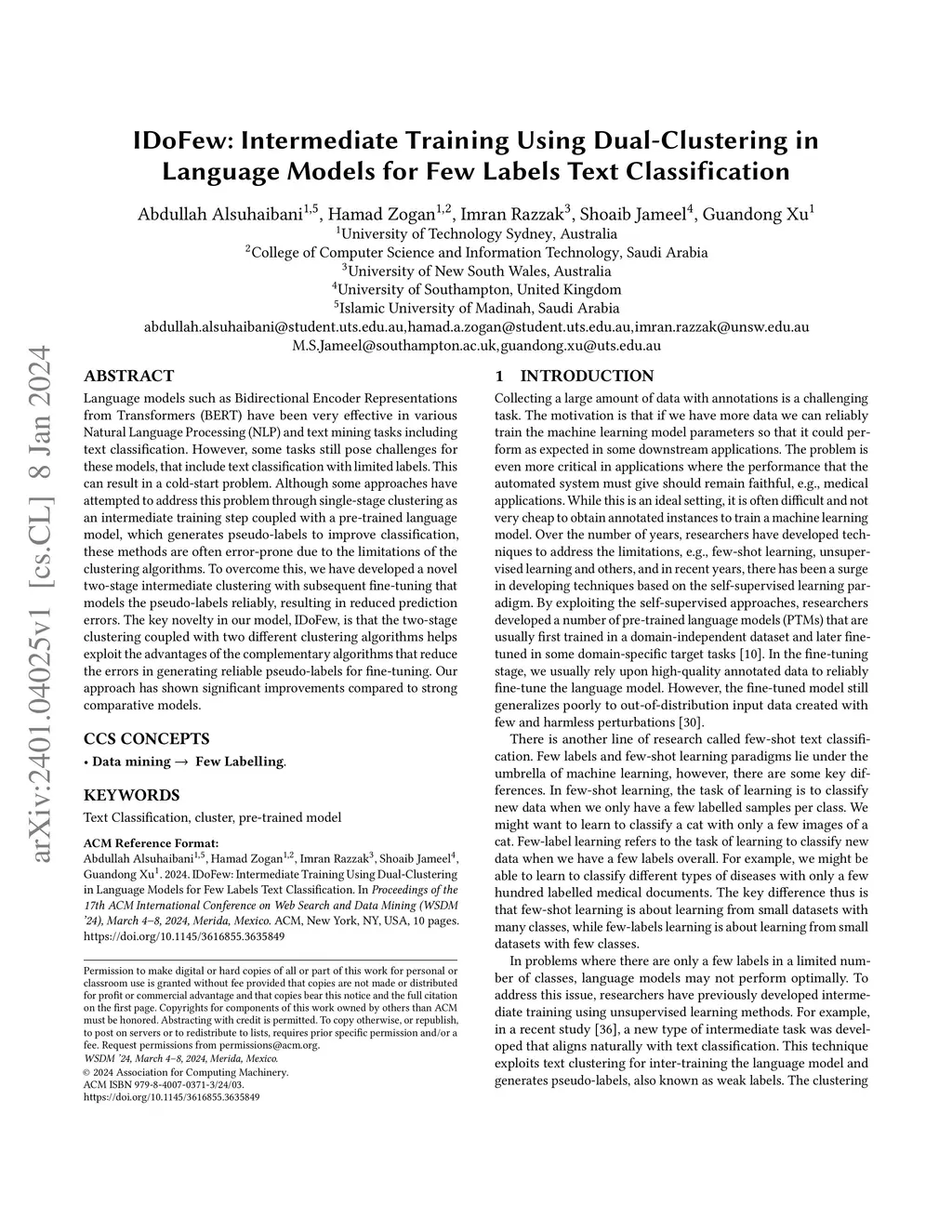 Language models such as Bidirectional Encoder Representations from Transformers (BERT) have been very effective in various Natural Language Processing (NLP) and text mining tasks including text classification. However, some tasks still pose challenges for these models, including text classification with limited labels. This can result in a cold-start problem. Although some approaches have attempted to address this problem through single-stage clustering as an intermediate training step coupled with a pre-trained language model, which generates pseudo-labels to improve classification, these methods are often error-prone due to the limitations of the clustering algorithms. To overcome this, we have developed a novel two-stage intermediate clustering with subsequent fine-tuning that models the pseudo-labels reliably, resulting in reduced prediction errors. The key novelty in our model, IDoFew, is that the two-stage clustering coupled with two different clustering algorithms helps exploit the advantages of the complementary algorithms that reduce the errors in generating reliable pseudo-labels for fine-tuning. Our approach has shown significant improvements compared to strong comparative models.