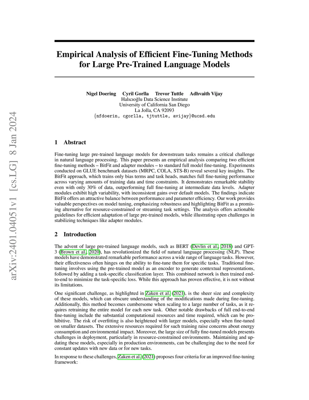 Fine-tuning large pre-trained language models for downstream tasks remains a critical challenge in natural language processing. This paper presents an empirical analysis comparing two efficient fine-tuning methods - BitFit and adapter modules - to standard full model fine-tuning. Experiments conducted on GLUE benchmark datasets (MRPC, COLA, STS-B) reveal several key insights. The BitFit approach, which trains only bias terms and task heads, matches full fine-tuning performance across varying amounts of training data and time constraints. It demonstrates remarkable stability even with only 30\% of data, outperforming full fine-tuning at intermediate data levels. Adapter modules exhibit high variability, with inconsistent gains over default models. The findings indicate BitFit offers an attractive balance between performance and parameter efficiency. Our work provides valuable perspectives on model tuning, emphasizing robustness and highlighting BitFit as a promising alternative for resource-constrained or streaming task settings. The analysis offers actionable guidelines for efficient adaptation of large pre-trained models, while illustrating open challenges in stabilizing techniques like adapter modules.