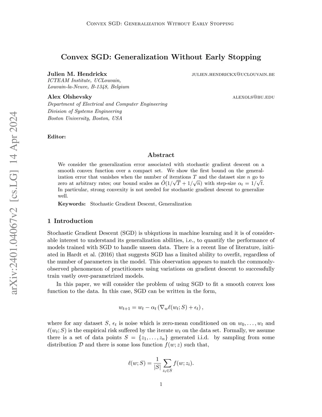 We consider the generalization error associated with stochastic gradient descent on a smooth convex function over a compact set. We show the first bound on the generalization error that vanishes when the number of iterations and the dataset size go to zero at arbitrary rates; our bound scales as with step-size . In particular, strong convexity is not needed for stochastic gradient descent to generalize well.