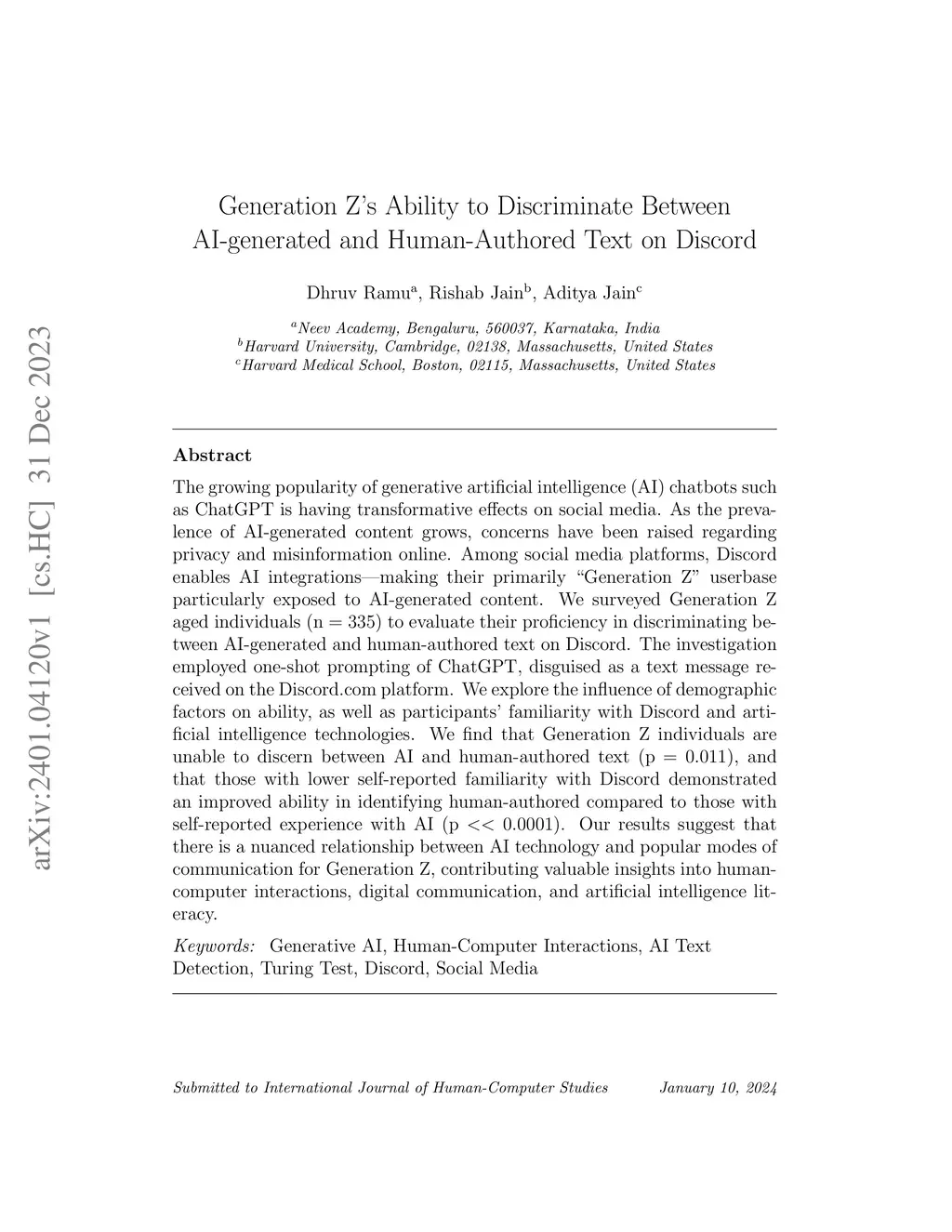 The growing popularity of generative artificial intelligence (AI) chatbots such as ChatGPT is having transformative effects on social media. As the prevalence of AI-generated content grows, concerns have been raised regarding privacy and misinformation online. Among social media platforms, Discord enables AI integrations -- making their primarily "Generation Z" userbase particularly exposed to AI-generated content. We surveyed Generation Z aged individuals (n = 335) to evaluate their proficiency in discriminating between AI-generated and human-authored text on Discord. The investigation employed one-shot prompting of ChatGPT, disguised as a text message received on the Discord.com platform. We explore the influence of demographic factors on ability, as well as participants' familiarity with Discord and artificial intelligence technologies. We find that Generation Z individuals are unable to discern between AI and human-authored text (p = 0.011), and that those with lower self-reported familiarity with Discord demonstrated an improved ability in identifying human-authored compared to those with self-reported experience with AI (p << 0.0001). Our results suggest that there is a nuanced relationship between AI technology and popular modes of communication for Generation Z, contributing valuable insights into human-computer interactions, digital communication, and artificial intelligence literacy.