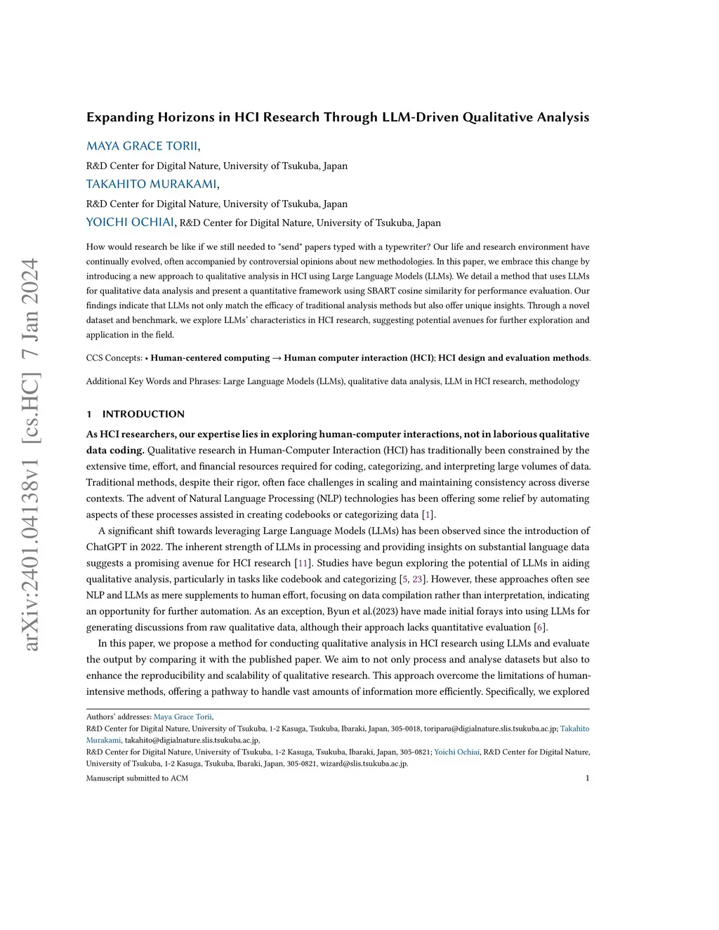 How would research be like if we still needed to "send" papers typed with a typewriter? Our life and research environment have continually evolved, often accompanied by controversial opinions about new methodologies. In this paper, we embrace this change by introducing a new approach to qualitative analysis in HCI using Large Language Models (LLMs). We detail a method that uses LLMs for qualitative data analysis and present a quantitative framework using SBART cosine similarity for performance evaluation. Our findings indicate that LLMs not only match the efficacy of traditional analysis methods but also offer unique insights. Through a novel dataset and benchmark, we explore LLMs' characteristics in HCI research, suggesting potential avenues for further exploration and application in the field.