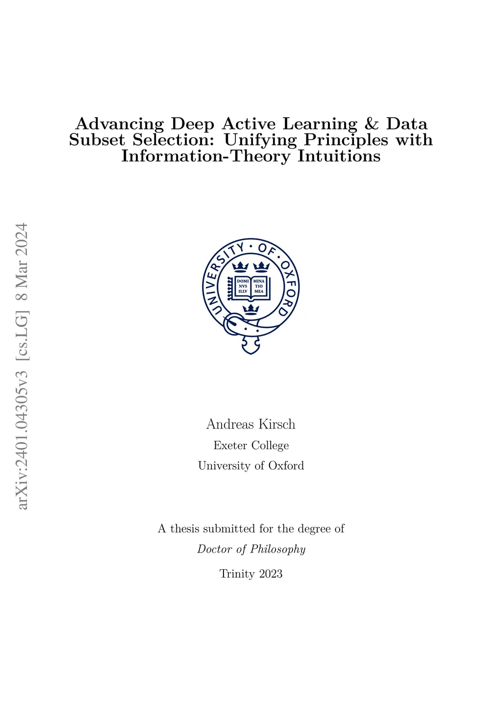 At its core, this thesis aims to enhance the practicality of deep learning by improving the label and training efficiency of deep learning models. To this end, we investigate data subset selection techniques, specifically active learning and active sampling, grounded in information-theoretic principles. Active learning improves label efficiency, while active sampling enhances training efficiency. Supervised deep learning models often require extensive training with labeled data. Label acquisition can be expensive and time-consuming, and training large models is resource-intensive, hindering the adoption outside academic research and "big tech." Existing methods for data subset selection in deep learning often rely on heuristics or lack a principled information-theoretic foundation. In contrast, this thesis examines several objectives for data subset selection and their applications within deep learning, striving for a more principled approach inspired by information theory. We begin by disentangling epistemic and aleatoric uncertainty in single forward-pass deep neural networks, which provides helpful intuitions and insights into different forms of uncertainty and their relevance for data subset selection. We then propose and investigate various approaches for active learning and data subset selection in (Bayesian) deep learning. Finally, we relate various existing and proposed approaches to approximations of information quantities in weight or prediction space. Underpinning this work is a principled and practical notation for information-theoretic quantities that includes both random variables and observed outcomes. This thesis demonstrates the benefits of working from a unified perspective and highlights the potential impact of our contributions to the practical application of deep learning.