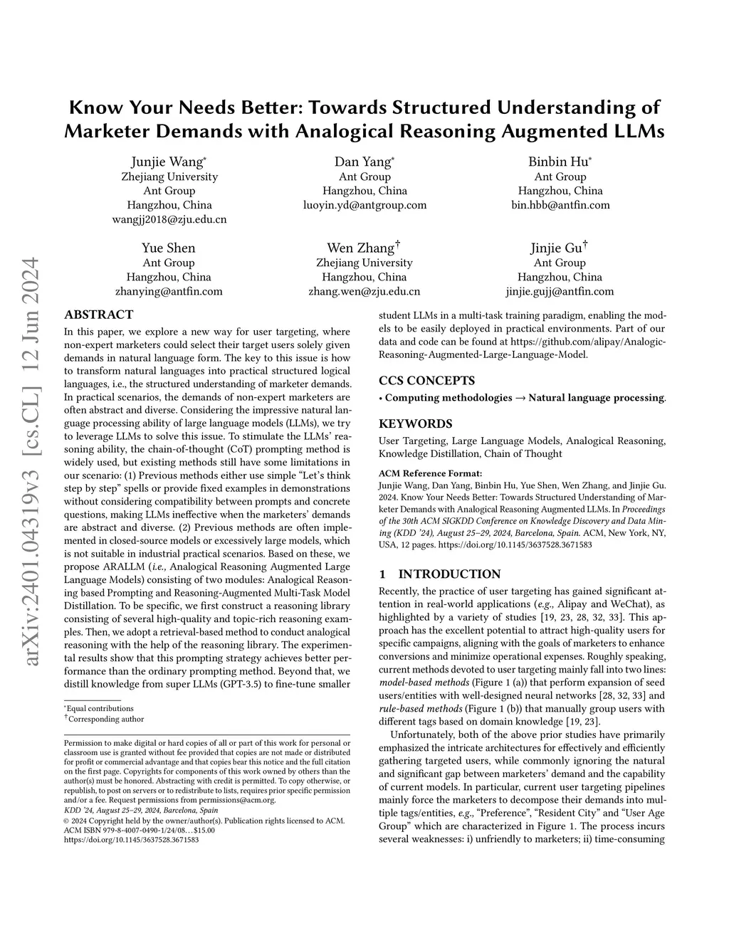 In this paper, we explore a new way for user targeting, where non-expert marketers could select their target users solely given demands in natural language form. The key to this issue is how to transform natural languages into practical structured logical languages, i.e., the structured understanding of marketer demands. In practical scenarios, the demands of non-expert marketers are often abstract and diverse. Considering the impressive natural language processing ability of large language models (LLMs), we try to leverage LLMs to solve this issue. To stimulate the LLMs' reasoning ability, the chain-of-thought (CoT) prompting method is widely used, but existing methods still have some limitations in our scenario: (1) Previous methods either use simple "Let's think step by step" spells or provide fixed examples in demonstrations without considering compatibility between prompts and concrete questions, making LLMs ineffective when the marketers' demands are abstract and diverse. (2) Previous methods are often implemented in closed-source models or excessively large models, which is not suitable in industrial practical scenarios. Based on these, we propose ARALLM (i.e., Analogical Reasoning Augmented Large Language Models) consisting of two modules: Analogical Reasoning based Prompting and Reasoning-Augmented Multi-Task Model Distillation. Part of our data and code can be found at https://github.com/alipay/Analogic-Reasoning-Augmented-Large-Language-Model.