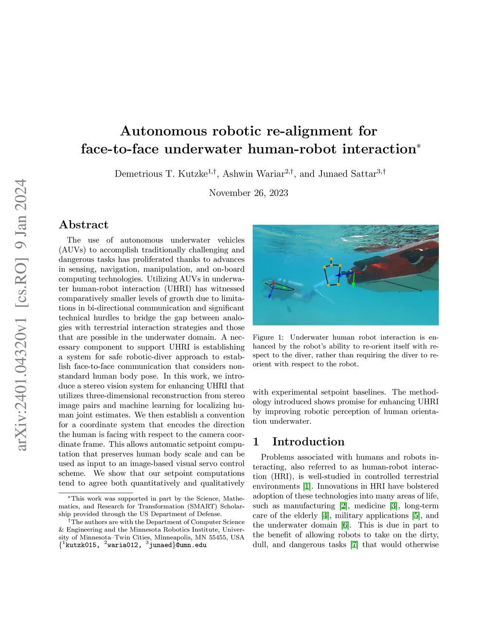 The use of autonomous underwater vehicles (AUVs) to accomplish traditionally challenging and dangerous tasks has proliferated thanks to advances in sensing, navigation, manipulation, and on-board computing technologies. Utilizing AUVs in underwater human-robot interaction (UHRI) has witnessed comparatively smaller levels of growth due to limitations in bi-directional communication and significant technical hurdles to bridge the gap between analogies with terrestrial interaction strategies and those that are possible in the underwater domain. A necessary component to support UHRI is establishing a system for safe robotic-diver approach to establish face-to-face communication that considers non-standard human body pose. In this work, we introduce a stereo vision system for enhancing UHRI that utilizes three-dimensional reconstruction from stereo image pairs and machine learning for localizing human joint estimates. We then establish a convention for a coordinate system that encodes the direction the human is facing with respect to the camera coordinate frame. This allows automatic setpoint computation that preserves human body scale and can be used as input to an image-based visual servo control scheme. We show that our setpoint computations tend to agree both quantitatively and qualitatively with experimental setpoint baselines. The methodology introduced shows promise for enhancing UHRI by improving robotic perception of human orientation underwater.
