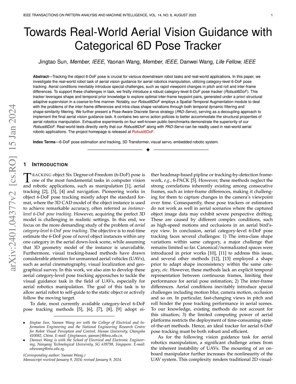 Tracking the object 6-DoF pose is crucial for various downstream robot tasks and real-world applications. In this paper, we investigate the real-world robot task of aerial vision guidance for aerial robotics manipulation, utilizing category-level 6-DoF pose tracking. Aerial conditions inevitably introduce special challenges, such as rapid viewpoint changes in pitch and roll and inter-frame differences. To support these challenges in task, we firstly introduce a robust category-level 6-DoF pose tracker (Robust6DoF). This tracker leverages shape and temporal prior knowledge to explore optimal inter-frame keypoint pairs, generated under a priori structural adaptive supervision in a coarse-to-fine manner. Notably, our Robust6DoF employs a Spatial-Temporal Augmentation module to deal with the problems of the inter-frame differences and intra-class shape variations through both temporal dynamic filtering and shape-similarity filtering. We further present a Pose-Aware Discrete Servo strategy (PAD-Servo), serving as a decoupling approach to implement the final aerial vision guidance task. It contains two servo action policies to better accommodate the structural properties of aerial robotics manipulation. Exhaustive experiments on four well-known public benchmarks demonstrate the superiority of our Robust6DoF. Real-world tests directly verify that our Robust6DoF along with PAD-Servo can be readily used in real-world aerial robotic applications.