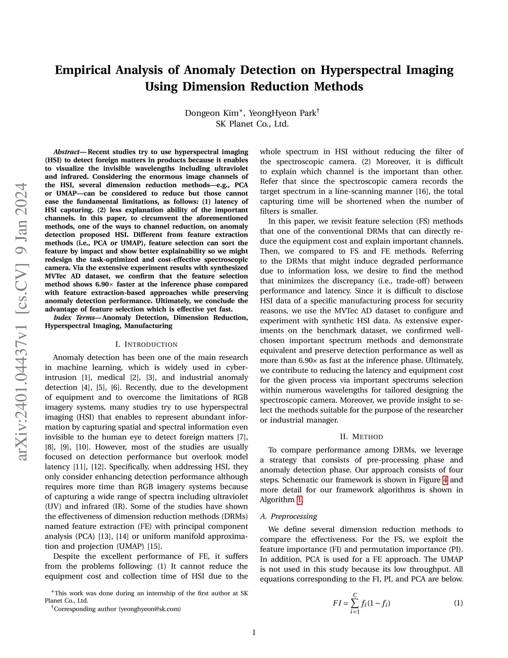 Recent studies try to use hyperspectral imaging (HSI) to detect foreign matters in products because it enables to visualize the invisible wavelengths including ultraviolet and infrared. Considering the enormous image channels of the HSI, several dimension reduction methods-e.g., PCA or UMAP-can be considered to reduce but those cannot ease the fundamental limitations, as follows: (1) latency of HSI capturing. (2) less explanation ability of the important channels. In this paper, to circumvent the aforementioned methods, one of the ways to channel reduction, on anomaly detection proposed HSI. Different from feature extraction methods (i.e., PCA or UMAP), feature selection can sort the feature by impact and show better explainability so we might redesign the task-optimized and cost-effective spectroscopic camera. Via the extensive experiment results with synthesized MVTec AD dataset, we confirm that the feature selection method shows 6.90x faster at the inference phase compared with feature extraction-based approaches while preserving anomaly detection performance. Ultimately, we conclude the advantage of feature selection which is effective yet fast.
