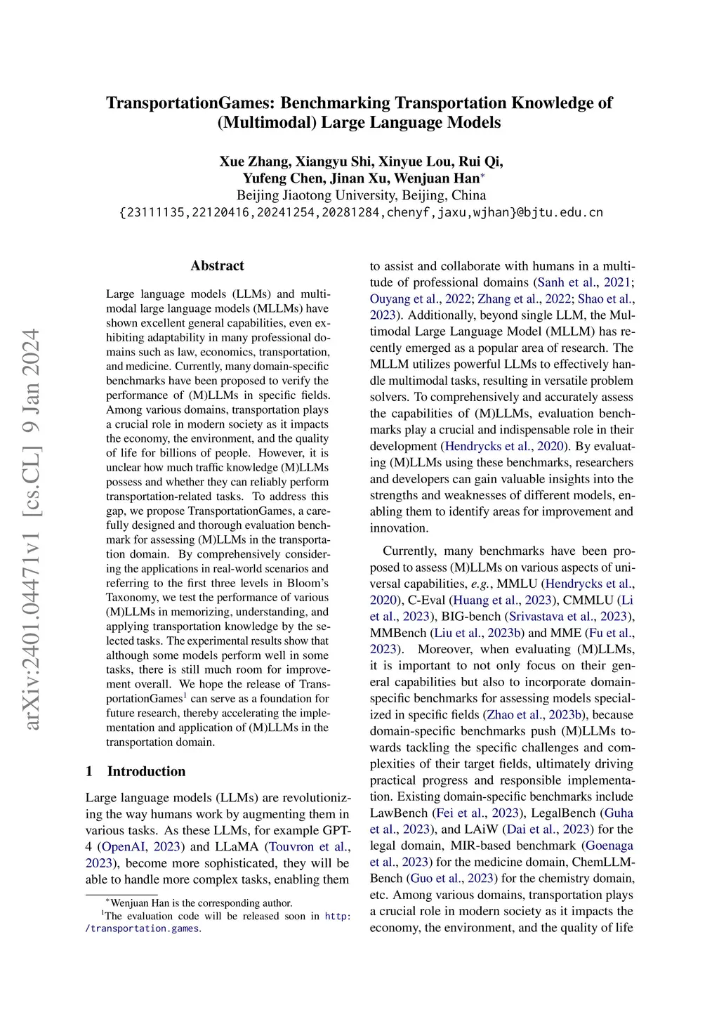 Large language models (LLMs) and multimodal large language models (MLLMs) have shown excellent general capabilities, even exhibiting adaptability in many professional domains such as law, economics, transportation, and medicine. Currently, many domain-specific benchmarks have been proposed to verify the performance of (M)LLMs in specific fields. Among various domains, transportation plays a crucial role in modern society as it impacts the economy, the environment, and the quality of life for billions of people. However, it is unclear how much traffic knowledge (M)LLMs possess and whether they can reliably perform transportation-related tasks. To address this gap, we propose TransportationGames, a carefully designed and thorough evaluation benchmark for assessing (M)LLMs in the transportation domain. By comprehensively considering the applications in real-world scenarios and referring to the first three levels in Bloom's Taxonomy, we test the performance of various (M)LLMs in memorizing, understanding, and applying transportation knowledge by the selected tasks. The experimental results show that although some models perform well in some tasks, there is still much room for improvement overall. We hope the release of TransportationGames can serve as a foundation for future research, thereby accelerating the implementation and application of (M)LLMs in the transportation domain.