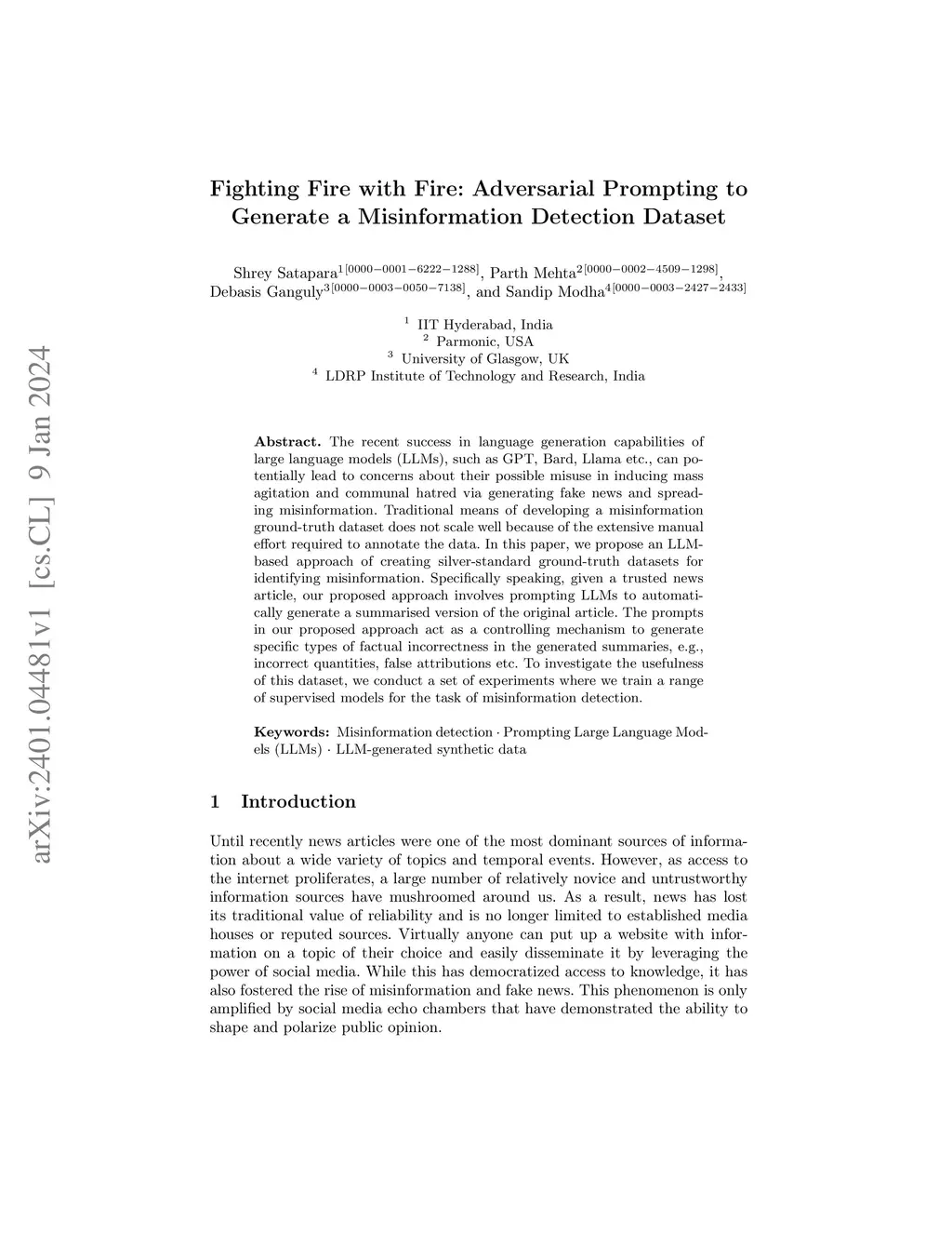 The recent success in language generation capabilities of large language models (LLMs), such as GPT, Bard, Llama etc., can potentially lead to concerns about their possible misuse in inducing mass agitation and communal hatred via generating fake news and spreading misinformation. Traditional means of developing a misinformation ground-truth dataset does not scale well because of the extensive manual effort required to annotate the data. In this paper, we propose an LLM-based approach of creating silver-standard ground-truth datasets for identifying misinformation. Specifically speaking, given a trusted news article, our proposed approach involves prompting LLMs to automatically generate a summarised version of the original article. The prompts in our proposed approach act as a controlling mechanism to generate specific types of factual incorrectness in the generated summaries, e.g., incorrect quantities, false attributions etc. To investigate the usefulness of this dataset, we conduct a set of experiments where we train a range of supervised models for the task of misinformation detection.