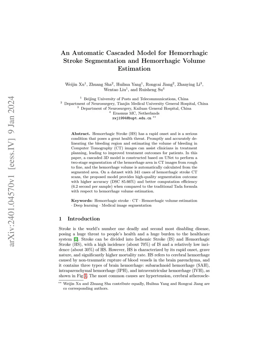 An Automatic Cascaded Model for Hemorrhagic Stroke Segmentation and
