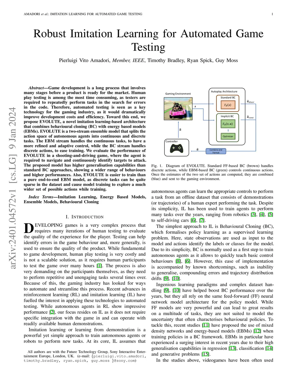 Game development is a long process that involves many stages before a product is ready for the market. Human play testing is among the most time consuming, as testers are required to repeatedly perform tasks in the search for errors in the code. Therefore, automated testing is seen as a key technology for the gaming industry, as it would dramatically improve development costs and efficiency. Toward this end, we propose EVOLUTE, a novel imitation learning-based architecture that combines behavioural cloning (BC) with energy based models (EBMs). EVOLUTE is a two-stream ensemble model that splits the action space of autonomous agents into continuous and discrete tasks. The EBM stream handles the continuous tasks, to have a more refined and adaptive control, while the BC stream handles discrete actions, to ease training. We evaluate the performance of EVOLUTE in a shooting-and-driving game, where the agent is required to navigate and continuously identify targets to attack. The proposed model has higher generalisation capabilities than standard BC approaches, showing a wider range of behaviours and higher performances. Also, EVOLUTE is easier to train than a pure end-to-end EBM model, as discrete tasks can be quite sparse in the dataset and cause model training to explore a much wider set of possible actions while training.