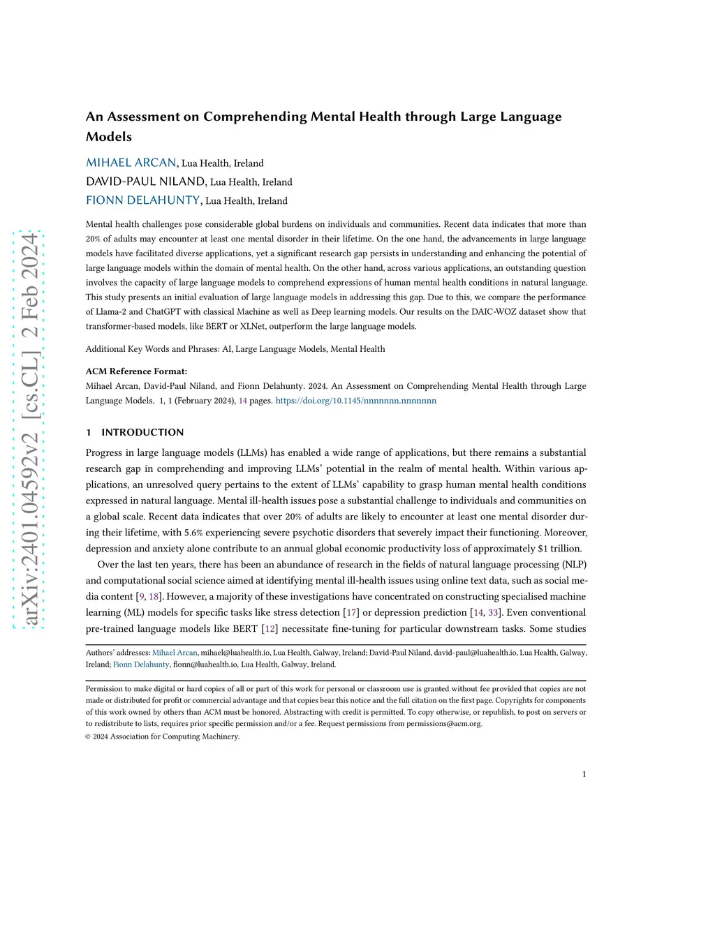 Mental health challenges pose considerable global burdens on individuals and communities. Recent data indicates that more than 20% of adults may encounter at least one mental disorder in their lifetime. On the one hand, the advancements in large language models have facilitated diverse applications, yet a significant research gap persists in understanding and enhancing the potential of large language models within the domain of mental health. On the other hand, across various applications, an outstanding question involves the capacity of large language models to comprehend expressions of human mental health conditions in natural language. This study presents an initial evaluation of large language models in addressing this gap. Due to this, we compare the performance of Llama-2 and ChatGPT with classical Machine as well as Deep learning models. Our results on the DAIC-WOZ dataset show that transformer-based models, like BERT or XLNet, outperform the large language models.