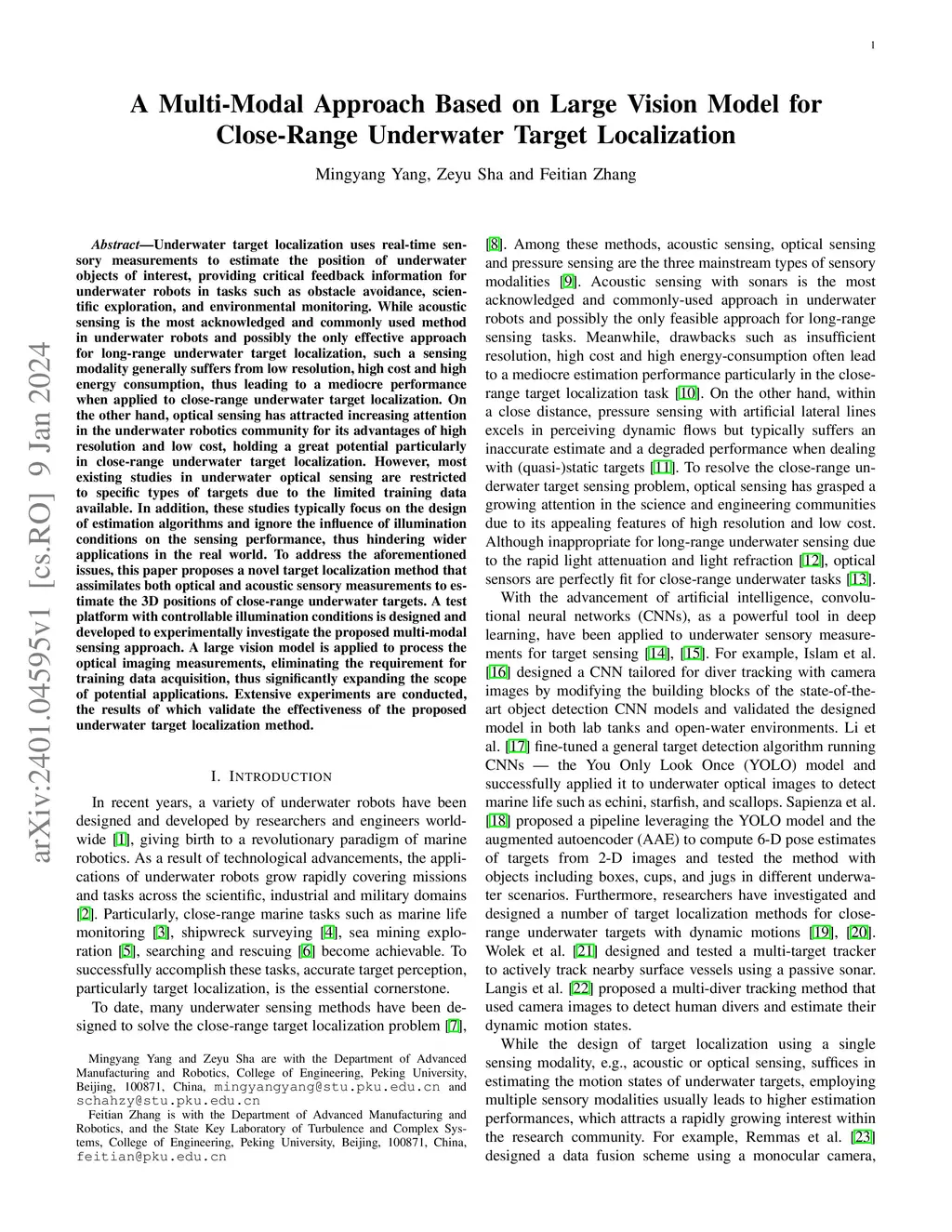 Underwater target localization uses real-time sensory measurements to estimate the position of underwater objects of interest, providing critical feedback information for underwater robots. While acoustic sensing is the most acknowledged method in underwater robots and possibly the only effective approach for long-range underwater target localization, such a sensing modality generally suffers from low resolution, high cost and high energy consumption, thus leading to a mediocre performance when applied to close-range underwater target localization. On the other hand, optical sensing has attracted increasing attention in the underwater robotics community for its advantages of high resolution and low cost, holding a great potential particularly in close-range underwater target localization. However, most existing studies in underwater optical sensing are restricted to specific types of targets due to the limited training data available. In addition, these studies typically focus on the design of estimation algorithms and ignore the influence of illumination conditions on the sensing performance, thus hindering wider applications in the real world. To address the aforementioned issues, this paper proposes a novel target localization method that assimilates both optical and acoustic sensory measurements to estimate the 3D positions of close-range underwater targets. A test platform with controllable illumination conditions is designed and developed to experimentally investigate the proposed multi-modal sensing approach. A large vision model is applied to process the optical imaging measurements, eliminating the requirement for training data acquisition, thus significantly expanding the scope of potential applications. Extensive experiments are conducted, the results of which validate the effectiveness of the proposed underwater target localization method.