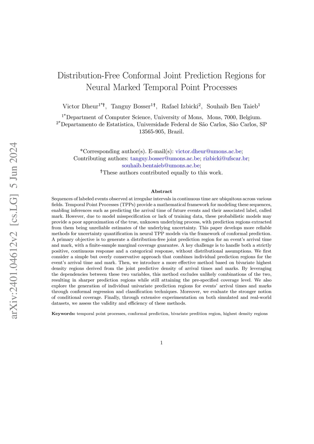 Sequences of labeled events observed at irregular intervals in continuous time are ubiquitous across various fields. Temporal Point Processes (TPPs) provide a mathematical framework for modeling these sequences, enabling inferences such as predicting the arrival time of future events and their associated label, called mark. However, due to model misspecification or lack of training data, these probabilistic models may provide a poor approximation of the true, unknown underlying process, with prediction regions extracted from them being unreliable estimates of the underlying uncertainty. This paper develops more reliable methods for uncertainty quantification in neural TPP models via the framework of conformal prediction. A primary objective is to generate a distribution-free joint prediction region for an event's arrival time and mark, with a finite-sample marginal coverage guarantee. A key challenge is to handle both a strictly positive, continuous response and a categorical response, without distributional assumptions. We first consider a simple but conservative approach that combines individual prediction regions for the event's arrival time and mark. Then, we introduce a more effective method based on bivariate highest density regions derived from the joint predictive density of arrival times and marks. By leveraging the dependencies between these two variables, this method excludes unlikely combinations of the two, resulting in sharper prediction regions while still attaining the pre-specified coverage level. We also explore the generation of individual univariate prediction regions for events' arrival times and marks through conformal regression and classification techniques. Moreover, we evaluate the stronger notion of conditional coverage. Finally, through extensive experimentation on both simulated and real-world datasets, we assess the validity and efficiency of these methods.