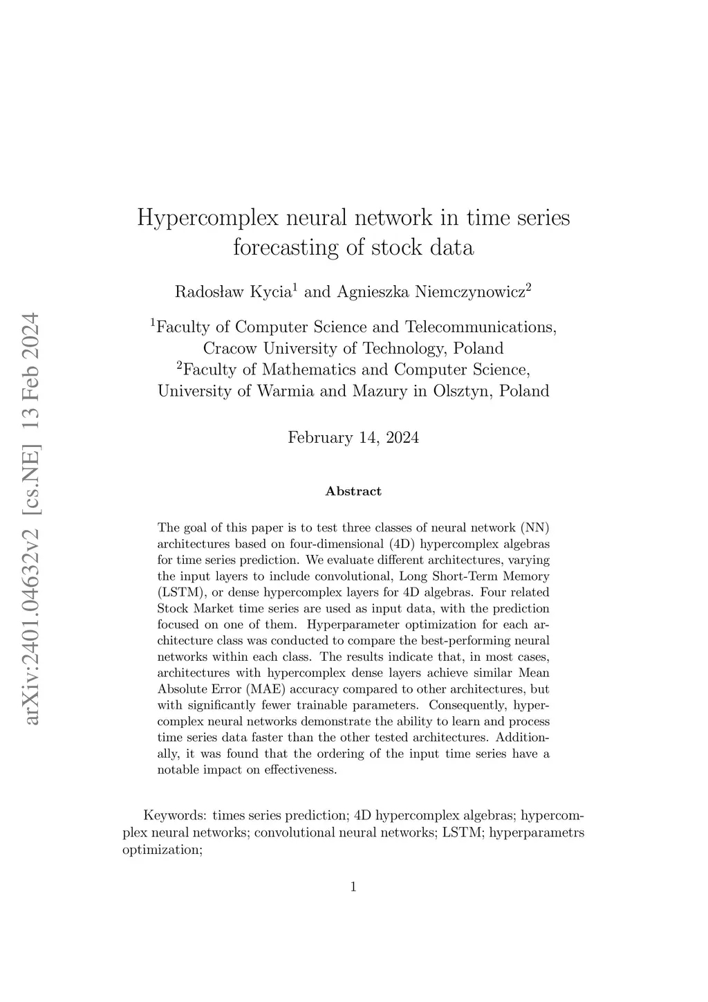 The goal of this paper is to test three classes of neural network (NN) architectures based on four-dimensional (4D) hypercomplex algebras for time series prediction. We evaluate different architectures, varying the input layers to include convolutional, Long Short-Term Memory (LSTM), or dense hypercomplex layers for 4D algebras. Four related Stock Market time series are used as input data, with the prediction focused on one of them. Hyperparameter optimization for each architecture class was conducted to compare the best-performing neural networks within each class. The results indicate that, in most cases, architectures with hypercomplex dense layers achieve similar Mean Absolute Error (MAE) accuracy compared to other architectures, but with significantly fewer trainable parameters. Consequently, hypercomplex neural networks demonstrate the ability to learn and process time series data faster than the other tested architectures. Additionally, it was found that the ordering of the input time series have a notable impact on effectiveness.