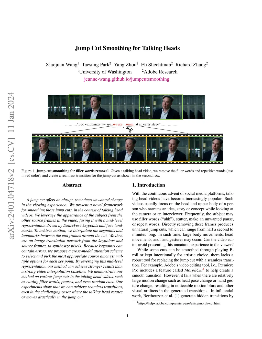 A jump cut offers an abrupt, sometimes unwanted change in the viewing experience. We present a novel framework for smoothing these jump cuts, in the context of talking head videos. We leverage the appearance of the subject from the other source frames in the video, fusing it with a mid-level representation driven by DensePose keypoints and face landmarks. To achieve motion, we interpolate the keypoints and landmarks between the end frames around the cut. We then use an image translation network from the keypoints and source frames, to synthesize pixels. Because keypoints can contain errors, we propose a cross-modal attention scheme to select and pick the most appropriate source amongst multiple options for each key point. By leveraging this mid-level representation, our method can achieve stronger results than a strong video interpolation baseline. We demonstrate our method on various jump cuts in the talking head videos, such as cutting filler words, pauses, and even random cuts. Our experiments show that we can achieve seamless transitions, even in the challenging cases where the talking head rotates or moves drastically in the jump cut.