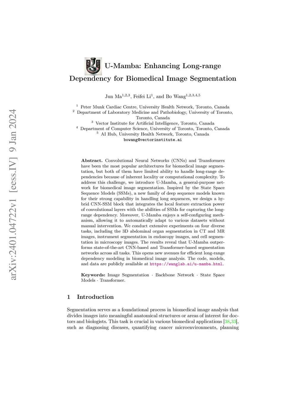 Convolutional Neural Networks (CNNs) and Transformers have been the most popular architectures for biomedical image segmentation, but both of them have limited ability to handle long-range dependencies because of inherent locality or computational complexity. To address this challenge, we introduce U-Mamba, a general-purpose network for biomedical image segmentation. Inspired by the State Space Sequence Models (SSMs), a new family of deep sequence models known for their strong capability in handling long sequences, we design a hybrid CNN-SSM block that integrates the local feature extraction power of convolutional layers with the abilities of SSMs for capturing the long-range dependency. Moreover, U-Mamba enjoys a self-configuring mechanism, allowing it to automatically adapt to various datasets without manual intervention. We conduct extensive experiments on four diverse tasks, including the 3D abdominal organ segmentation in CT and MR images, instrument segmentation in endoscopy images, and cell segmentation in microscopy images. The results reveal that U-Mamba outperforms state-of-the-art CNN-based and Transformer-based segmentation networks across all tasks. This opens new avenues for efficient long-range dependency modeling in biomedical image analysis. The code, models, and data are publicly available at https://wanglab.ai/u-mamba.html.