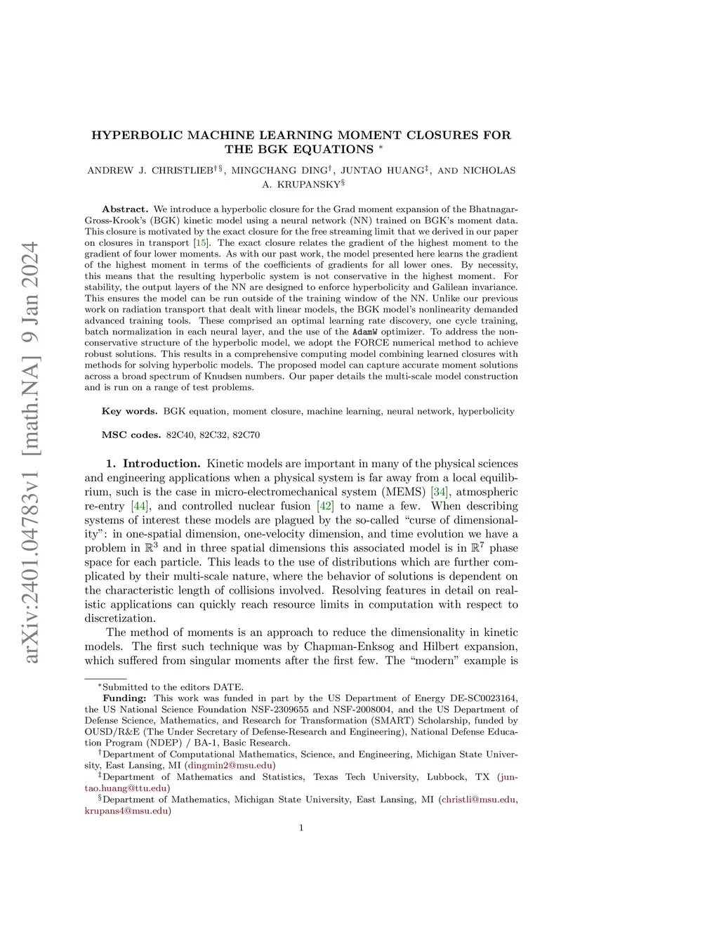 We introduce a hyperbolic closure for the Grad moment expansion of the Bhatnagar-Gross-Krook's (BGK) kinetic model using a neural network (NN) trained on BGK's moment data. This closure is motivated by the exact closure for the free streaming limit that we derived in our paper on closures in transport \cite{Huang2022-RTE1}. The exact closure relates the gradient of the highest moment to the gradient of four lower moments. As with our past work, the model presented here learns the gradient of the highest moment in terms of the coefficients of gradients for all lower ones. By necessity, this means that the resulting hyperbolic system is not conservative in the highest moment. For stability, the output layers of the NN are designed to enforce hyperbolicity and Galilean invariance. This ensures the model can be run outside of the training window of the NN. Unlike our previous work on radiation transport that dealt with linear models, the BGK model's nonlinearity demanded advanced training tools. These comprised an optimal learning rate discovery, one cycle training, batch normalization in each neural layer, and the use of the \texttt{AdamW} optimizer. To address the non-conservative structure of the hyperbolic model, we adopt the FORCE numerical method to achieve robust solutions. This results in a comprehensive computing model combining learned closures with methods for solving hyperbolic models. The proposed model can capture accurate moment solutions across a broad spectrum of Knudsen numbers. Our paper details the multi-scale model construction and is run on a range of test problems.