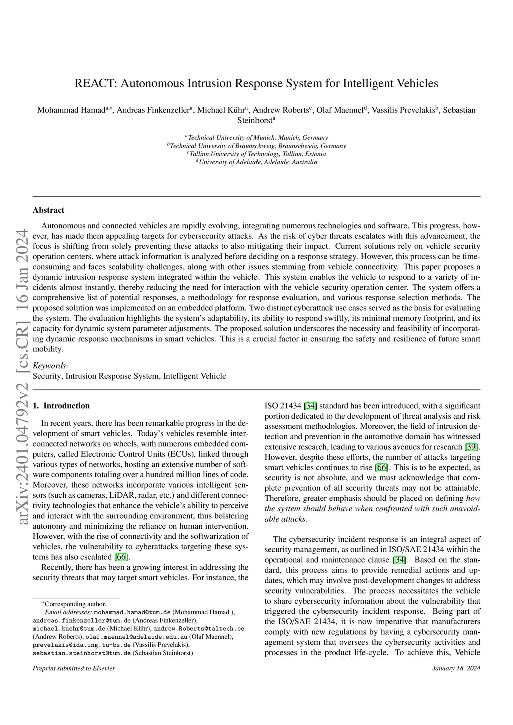 REACT: Autonomous Intrusion Response System for Intelligent Vehicles