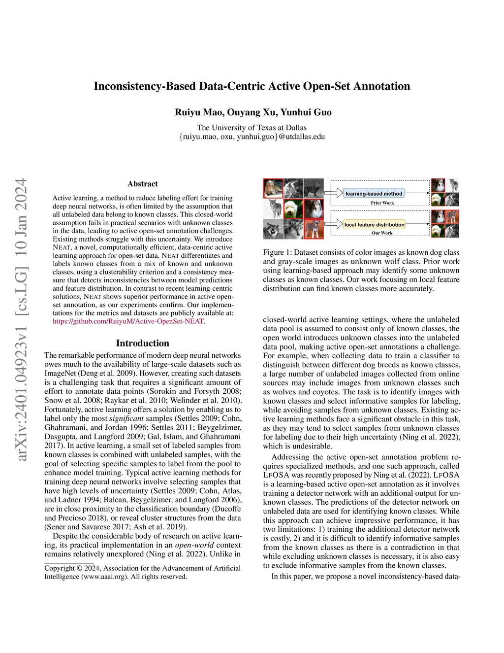 Active learning is a commonly used approach that reduces the labeling effort required to train deep neural networks. However, the effectiveness of current active learning methods is limited by their closed-world assumptions, which assume that all data in the unlabeled pool comes from a set of predefined known classes. This assumption is often not valid in practical situations, as there may be unknown classes in the unlabeled data, leading to the active open-set annotation problem. The presence of unknown classes in the data can significantly impact the performance of existing active learning methods due to the uncertainty they introduce. To address this issue, we propose a novel data-centric active learning method called NEAT that actively annotates open-set data. NEAT is designed to label known classes data from a pool of both known and unknown classes unlabeled data. It utilizes the clusterability of labels to identify the known classes from the unlabeled pool and selects informative samples from those classes based on a consistency criterion that measures inconsistencies between model predictions and local feature distribution. Unlike the recently proposed learning-centric method for the same problem, NEAT is much more computationally efficient and is a data-centric active open-set annotation method. Our experiments demonstrate that NEAT achieves significantly better performance than state-of-the-art active learning methods for active open-set annotation.