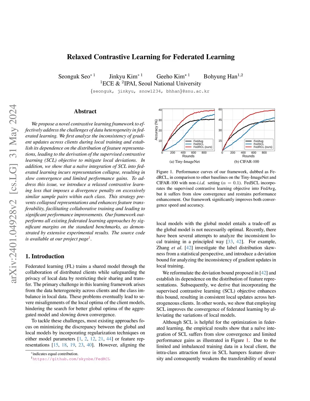 We propose a novel contrastive learning framework to effectively address the challenges of data heterogeneity in federated learning. We first analyze the inconsistency of gradient updates across clients during local training and establish its dependence on the distribution of feature representations, leading to the derivation of the supervised contrastive learning (SCL) objective to mitigate local deviations. In addition, we show that a na\"ive adoption of SCL in federated learning leads to representation collapse, resulting in slow convergence and limited performance gains. To address this issue, we introduce a relaxed contrastive learning loss that imposes a divergence penalty on excessively similar sample pairs within each class. This strategy prevents collapsed representations and enhances feature transferability, facilitating collaborative training and leading to significant performance improvements. Our framework outperforms all existing federated learning approaches by huge margins on the standard benchmarks through extensive experimental results.
