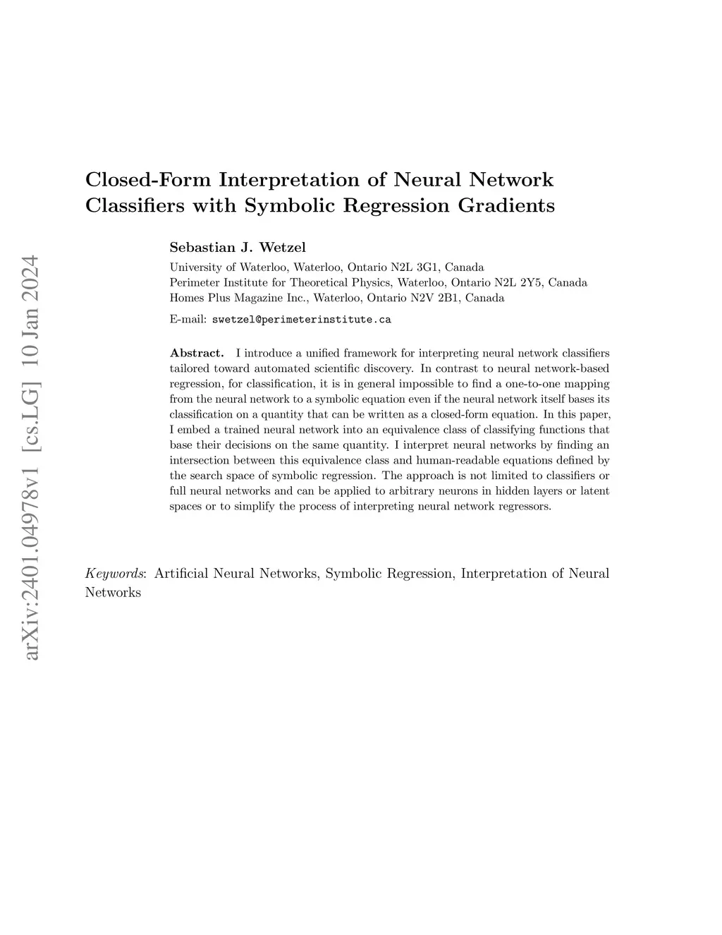 I introduce a unified framework for interpreting neural network classifiers tailored toward automated scientific discovery. In contrast to neural network-based regression, for classification, it is in general impossible to find a one-to-one mapping from the neural network to a symbolic equation even if the neural network itself bases its classification on a quantity that can be written as a closed-form equation. In this paper, I embed a trained neural network into an equivalence class of classifying functions that base their decisions on the same quantity. I interpret neural networks by finding an intersection between this equivalence class and human-readable equations defined by the search space of symbolic regression. The approach is not limited to classifiers or full neural networks and can be applied to arbitrary neurons in hidden layers or latent spaces or to simplify the process of interpreting neural network regressors.