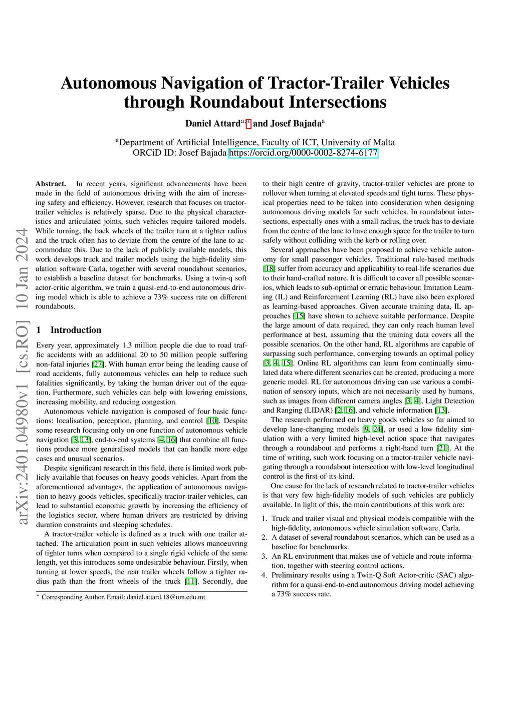 In recent years, significant advancements have been made in the field of autonomous driving with the aim of increasing safety and efficiency. However, research that focuses on tractor-trailer vehicles is relatively sparse. Due to the physical characteristics and articulated joints, such vehicles require tailored models. While turning, the back wheels of the trailer turn at a tighter radius and the truck often has to deviate from the centre of the lane to accommodate this. Due to the lack of publicly available models, this work develops truck and trailer models using the high-fidelity simulation software CARLA, together with several roundabout scenarios, to establish a baseline dataset for benchmarks. Using a twin-q soft actor-critic algorithm, we train a quasi-end-to-end autonomous driving model which is able to achieve a 73% success rate on different roundabouts.