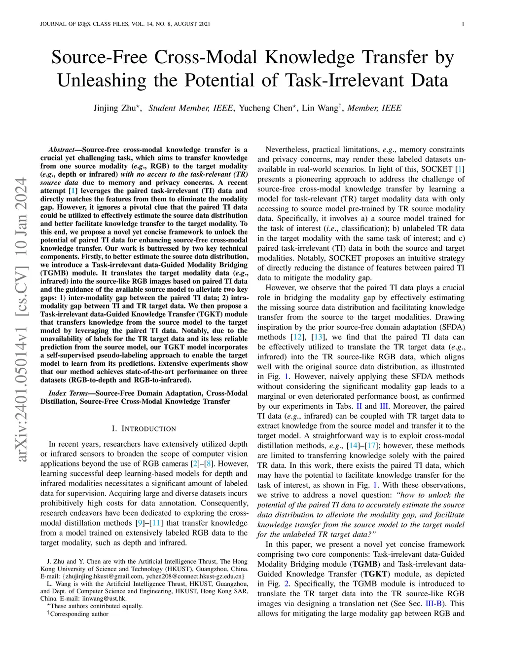 Source-free cross-modal knowledge transfer is a crucial yet challenging task, which aims to transfer knowledge from one source modality (e.g., RGB) to the target modality (e.g., depth or infrared) with no access to the task-relevant (TR) source data due to memory and privacy concerns. A recent attempt leverages the paired task-irrelevant (TI) data and directly matches the features from them to eliminate the modality gap. However, it ignores a pivotal clue that the paired TI data could be utilized to effectively estimate the source data distribution and better facilitate knowledge transfer to the target modality. To this end, we propose a novel yet concise framework to unlock the potential of paired TI data for enhancing source-free cross-modal knowledge transfer. Our work is buttressed by two key technical components. Firstly, to better estimate the source data distribution, we introduce a Task-irrelevant data-Guided Modality Bridging (TGMB) module. It translates the target modality data (e.g., infrared) into the source-like RGB images based on paired TI data and the guidance of the available source model to alleviate two key gaps: 1) inter-modality gap between the paired TI data; 2) intra-modality gap between TI and TR target data. We then propose a Task-irrelevant data-Guided Knowledge Transfer (TGKT) module that transfers knowledge from the source model to the target model by leveraging the paired TI data. Notably, due to the unavailability of labels for the TR target data and its less reliable prediction from the source model, our TGKT model incorporates a self-supervised pseudo-labeling approach to enable the target model to learn from its predictions. Extensive experiments show that our method achieves state-of-the-art performance on three datasets (RGB-to-depth and RGB-to-infrared).