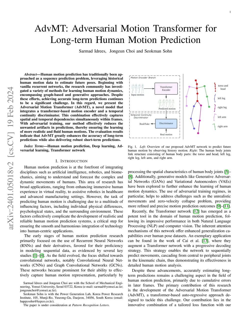 To achieve seamless collaboration between robots and humans in a shared environment, accurately predicting future human movements is essential. Human motion prediction has traditionally been approached as a sequence prediction problem, leveraging historical human motion data to estimate future poses. Beginning with vanilla recurrent networks, the research community has investigated a variety of methods for learning human motion dynamics, encompassing graph-based and generative approaches. Despite these efforts, achieving accurate long-term predictions continues to be a significant challenge. In this regard, we present the Adversarial Motion Transformer (AdvMT), a novel model that integrates a transformer-based motion encoder and a temporal continuity discriminator. This combination effectively captures spatial and temporal dependencies simultaneously within frames. With adversarial training, our method effectively reduces the unwanted artifacts in predictions, thereby ensuring the learning of more realistic and fluid human motions. The evaluation results indicate that AdvMT greatly enhances the accuracy of long-term predictions while also delivering robust short-term predictions