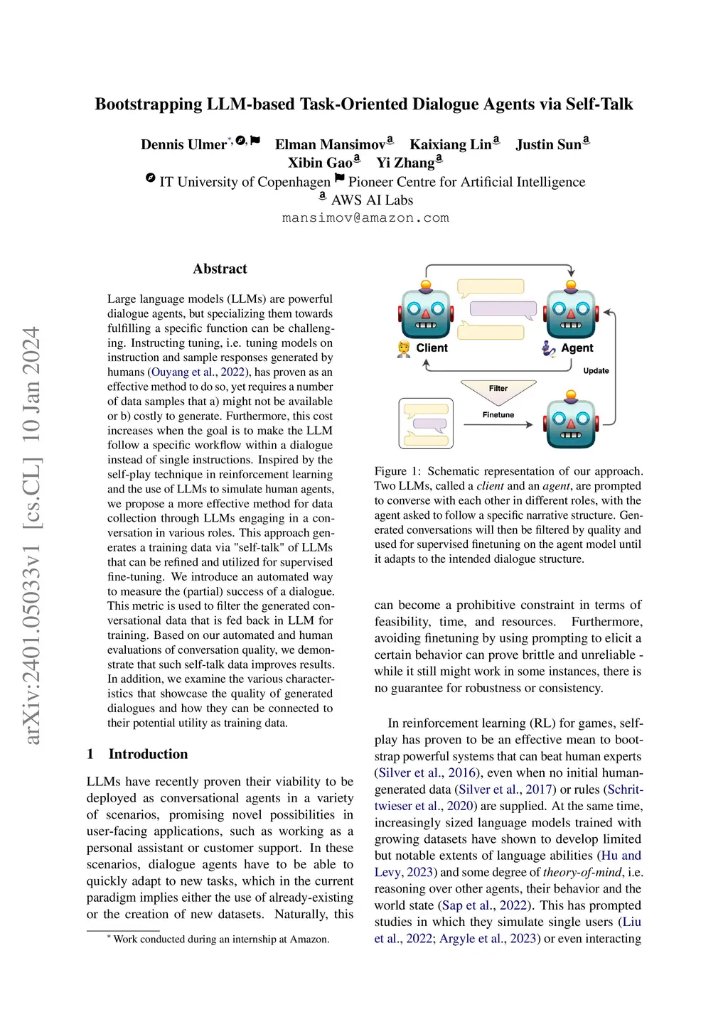 Large language models (LLMs) are powerful dialogue agents, but specializing them towards fulfilling a specific function can be challenging. Instructing tuning, i.e. tuning models on instruction and sample responses generated by humans (Ouyang et al., 2022), has proven as an effective method to do so, yet requires a number of data samples that a) might not be available or b) costly to generate. Furthermore, this cost increases when the goal is to make the LLM follow a specific workflow within a dialogue instead of single instructions. Inspired by the self-play technique in reinforcement learning and the use of LLMs to simulate human agents, we propose a more effective method for data collection through LLMs engaging in a conversation in various roles. This approach generates a training data via "self-talk" of LLMs that can be refined and utilized for supervised fine-tuning. We introduce an automated way to measure the (partial) success of a dialogue. This metric is used to filter the generated conversational data that is fed back in LLM for training. Based on our automated and human evaluations of conversation quality, we demonstrate that such self-talk data improves results. In addition, we examine the various characteristics that showcase the quality of generated dialogues and how they can be connected to their potential utility as training data.