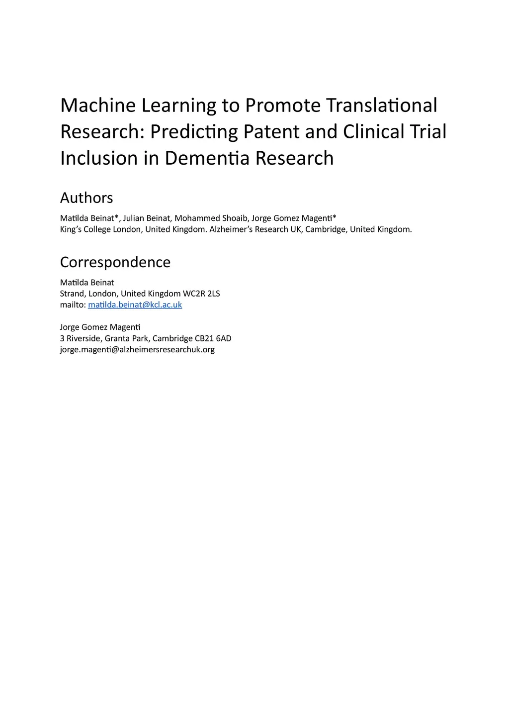 Projected to impact 1.6 million people in the UK by 2040 and costing {\pounds}25 billion annually, dementia presents a growing challenge to society. This study, a pioneering effort to predict the translational potential of dementia research using machine learning, hopes to address the slow translation of fundamental discoveries into practical applications despite dementia's significant societal and economic impact. We used the Dimensions database to extract data from 43,091 UK dementia research publications between the years 1990-2023, specifically metadata (authors, publication year etc.), concepts mentioned in the paper, and the paper abstract. To prepare the data for machine learning we applied methods such as one hot encoding and/or word embeddings. We trained a CatBoost Classifier to predict if a publication will be cited in a future patent or clinical trial. We trained several model variations. The model combining metadata, concept, and abstract embeddings yielded the highest performance: for patent predictions, an Area Under the Receiver Operating Characteristic Curve (AUROC) of 0.84 and 77.17% accuracy; for clinical trial predictions, an AUROC of 0.81 and 75.11% accuracy. The results demonstrate that integrating machine learning within current research methodologies can uncover overlooked publications, expediting the identification of promising research and potentially transforming dementia research by predicting real-world impact and guiding translational strategies.