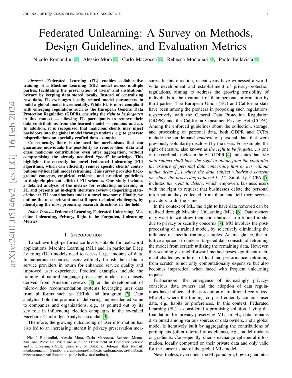 Federated Learning (FL) enables collaborative training of a Machine Learning (ML) model across multiple parties, facilitating the preservation of users' and institutions' privacy by keeping data stored locally. Instead of centralizing raw data, FL exchanges locally refined model parameters to build a global model incrementally. While FL is more compliant with emerging regulations such as the European General Data Protection Regulation (GDPR), ensuring the right to be forgotten in this context - allowing FL participants to remove their data contributions from the learned model - remains unclear. In addition, it is recognized that malicious clients may inject backdoors into the global model through updates, e.g. to generate mispredictions on specially crafted data examples. Consequently, there is the need for mechanisms that can guarantee individuals the possibility to remove their data and erase malicious contributions even after aggregation, without compromising the already acquired "good" knowledge. This highlights the necessity for novel Federated Unlearning (FU) algorithms, which can efficiently remove specific clients' contributions without full model retraining. This survey provides background concepts, empirical evidence, and practical guidelines to design/implement efficient FU schemes. Our study includes a detailed analysis of the metrics for evaluating unlearning in FL and presents an in-depth literature review categorizing state-of-the-art FU contributions under a novel taxonomy. Finally, we outline the most relevant and still open technical challenges, by identifying the most promising research directions in the field.