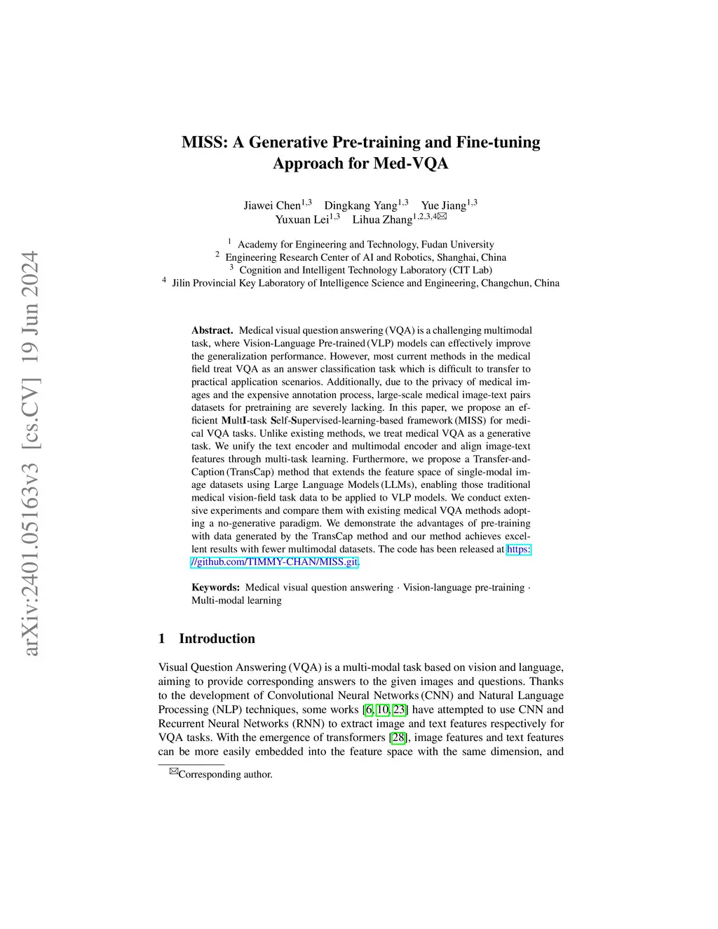 MISS: A Generative Pretraining and Finetuning Approach for Med-VQA