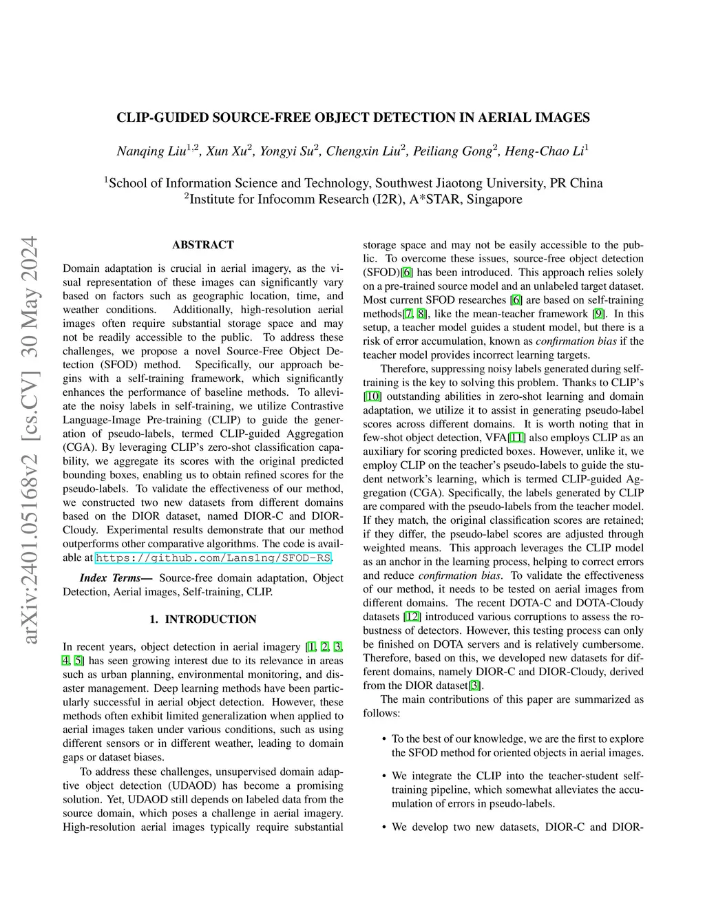 Domain adaptation is crucial in aerial imagery, as the visual representation of these images can significantly vary based on factors such as geographic location, time, and weather conditions. Additionally, high-resolution aerial images often require substantial storage space and may not be readily accessible to the public. To address these challenges, we propose a novel Source-Free Object Detection (SFOD) method. Specifically, our approach begins with a self-training framework, which significantly enhances the performance of baseline methods. To alleviate the noisy labels in self-training, we utilize Contrastive Language-Image Pre-training (CLIP) to guide the generation of pseudo-labels, termed CLIP-guided Aggregation (CGA). By leveraging CLIP's zero-shot classification capability, we aggregate its scores with the original predicted bounding boxes, enabling us to obtain refined scores for the pseudo-labels. To validate the effectiveness of our method, we constructed two new datasets from different domains based on the DIOR dataset, named DIOR-C and DIOR-Cloudy. Experimental results demonstrate that our method outperforms other comparative algorithms. The code is available at https://github.com/Lans1ng/SFOD-RS.