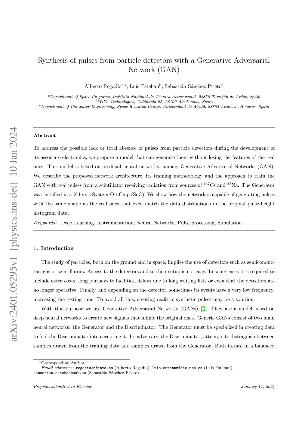 To address the possible lack or total absence of pulses from particle detectors during the development of its associate electronics, we propose a model that can generate them without losing the features of the real ones. This model is based on artificial neural networks, namely Generative Adversarial Networks (GAN). We describe the proposed network architecture, its training methodology and the approach to train the GAN with real pulses from a scintillator receiving radiation from sources of Cs and Na. The Generator was installed in a Xilinx's System-On-Chip (SoC). We show how the network is capable of generating pulses with the same shape as the real ones that even match the data distributions in the original pulse-height histogram data.